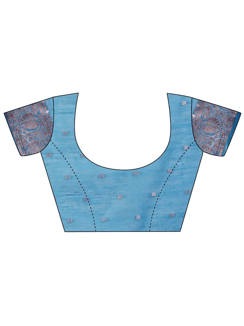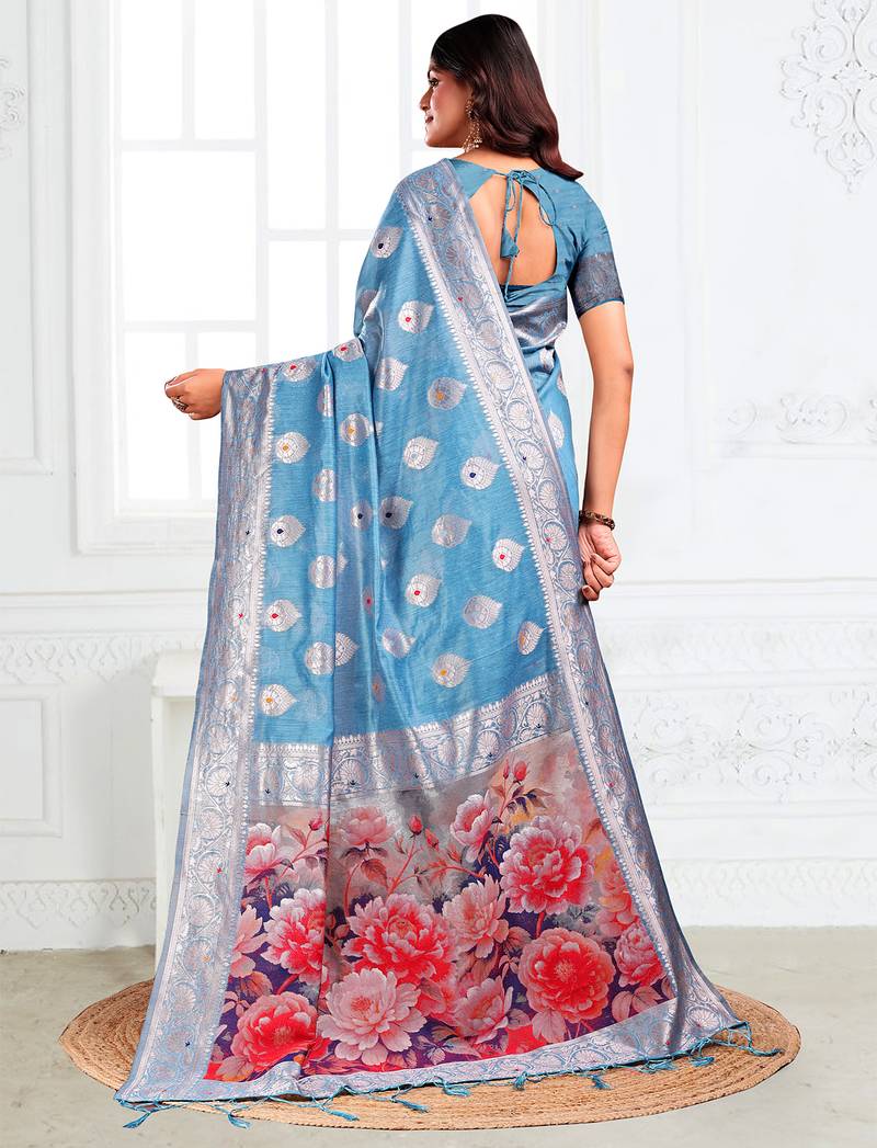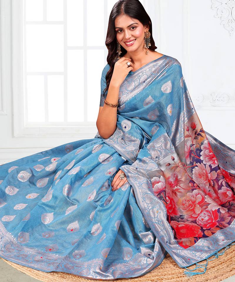 Product Name Sky Blue Color Printed & Woven Work Linen Cotton Saree