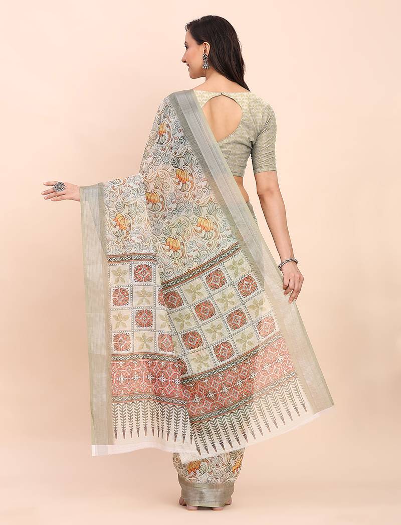| Product Name | White Color Digital Print & Zari Border Linen Cotton Saree | |