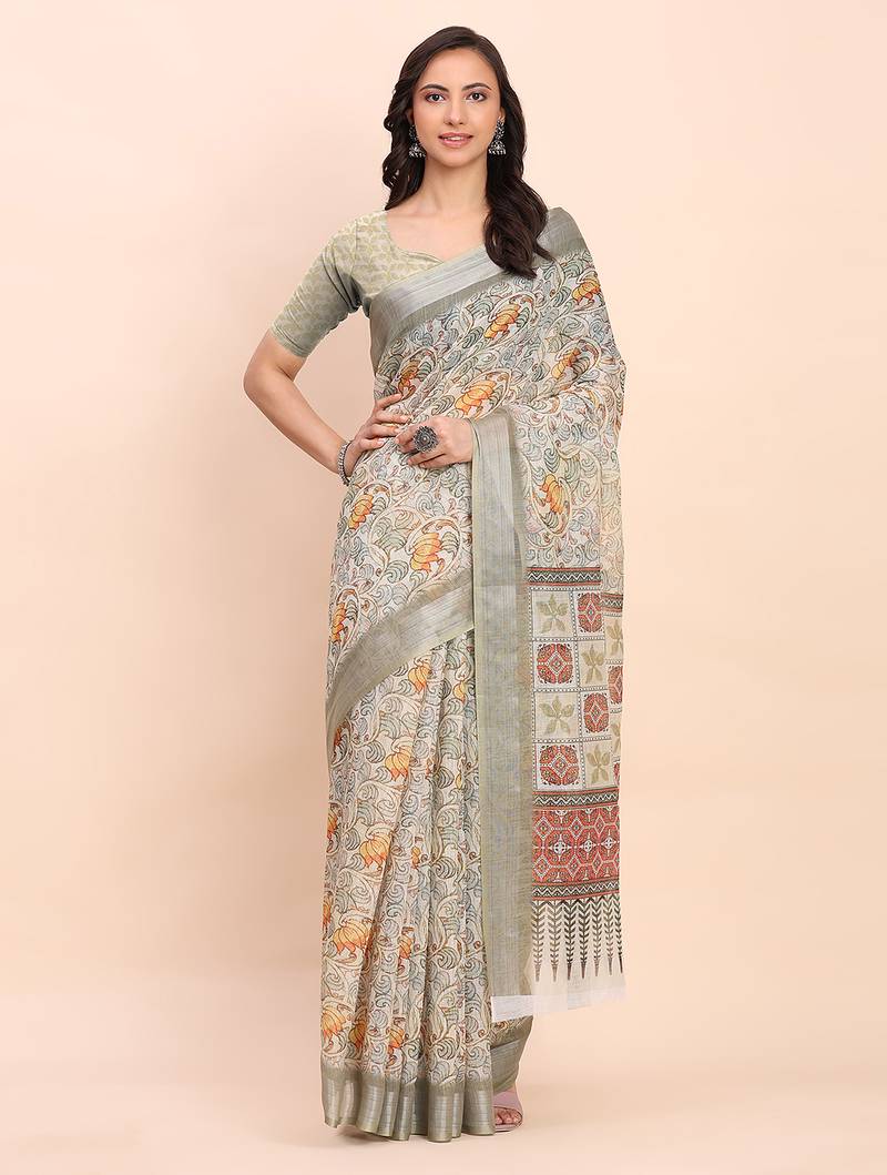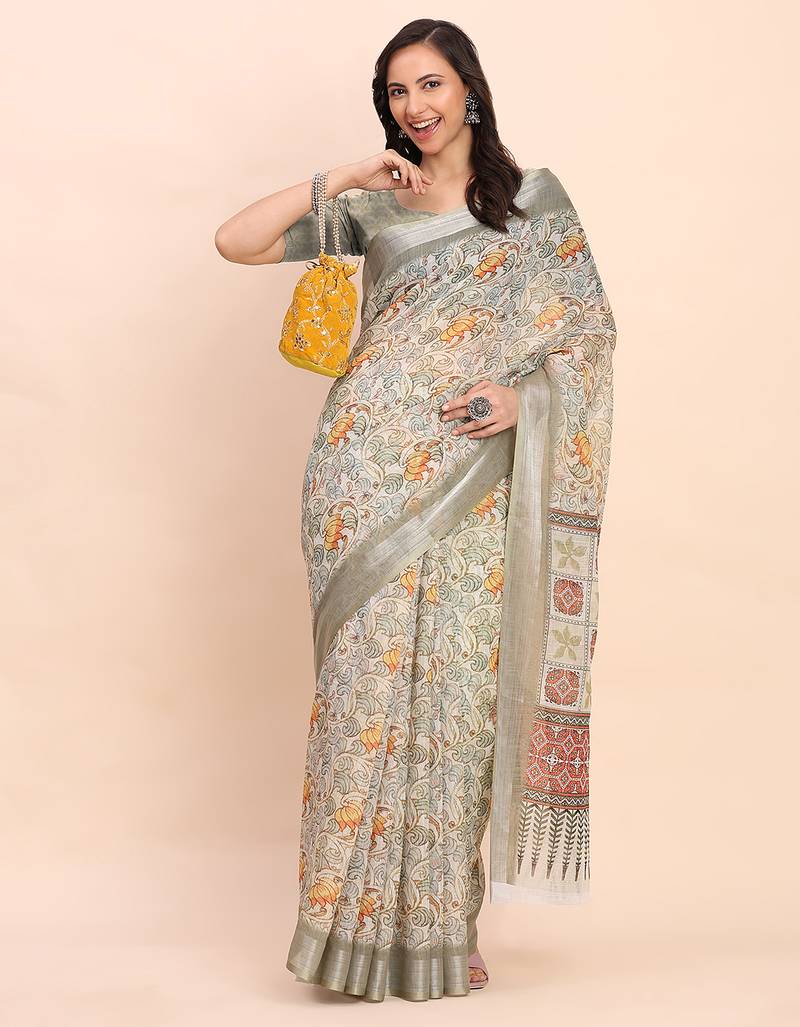 | Product Description | Linen Cotton Zari Border Digital Printed Saree With Un Stitched Blouse |