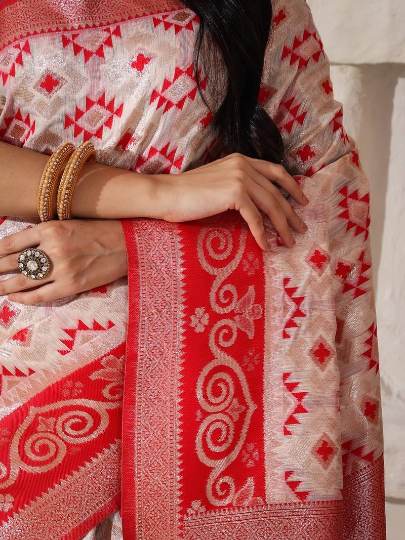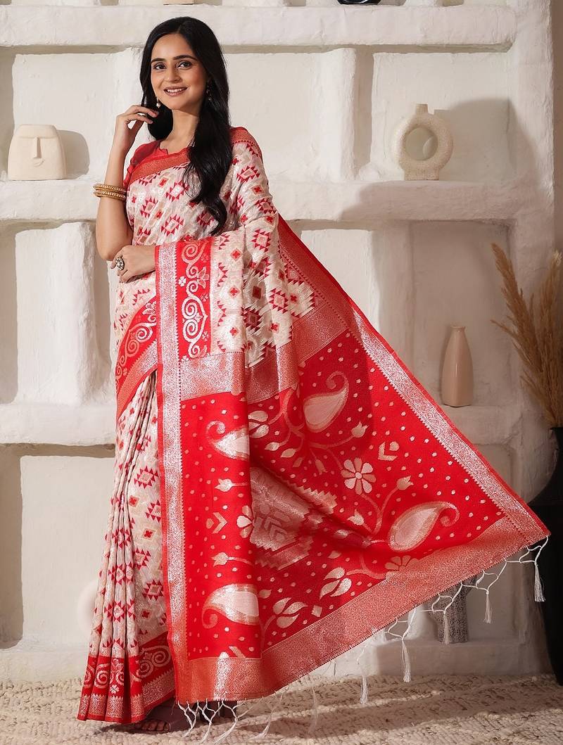 White & red color zari woven linen cotton art silk saree