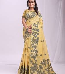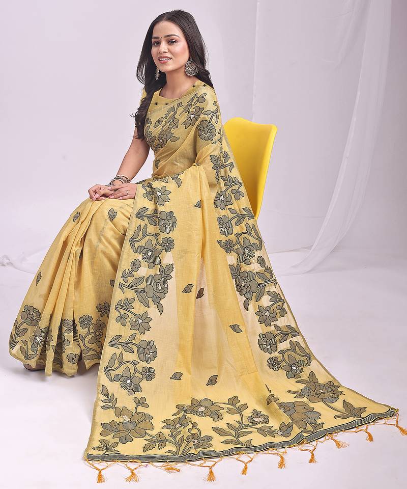 Yellow color embroidred linen cotton saree