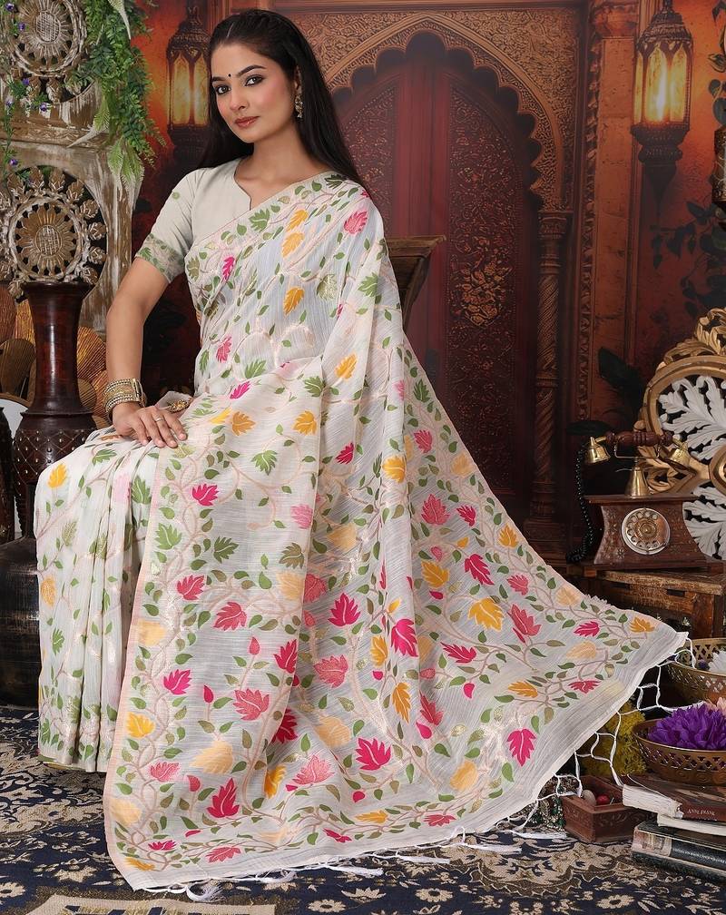 | Product Description | Linen Cotton Woven Zari Border Work Women's Beautiful Saree With Blouse Piece |
