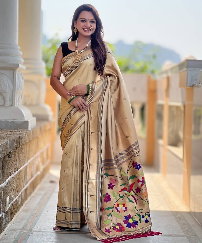 golden tissue paithani silk saree with zari weave