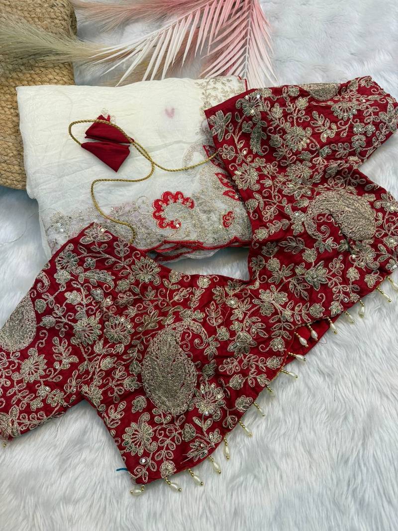 This White Organza Tissue Saree Is Crafted In Pure Crystal Organza Fabric, Offering A Lightweight Texture With A Smooth And Flowing Drape. The Saree Features Detailed Embroidery Spread Across The Body, Complemented By A Finely Worked Border With Coding And Woven Detailing That Adds Structure And Definition. Subtle Surface Embellishments Enhance The Overall Appearance While Maintaining An Elegant Balance. The Saree Is Paired With A Contrasting Crystal Organza Stitched Blouse, Finished With Coordinated Embroidery Work. Designed With Focus On Fabric Quality And Intricate Craftsmanship, This Embroidered Organza Tissue Saree Is Suitable For Weddings, Festive Occasions, And Formal Ethnic Wear.