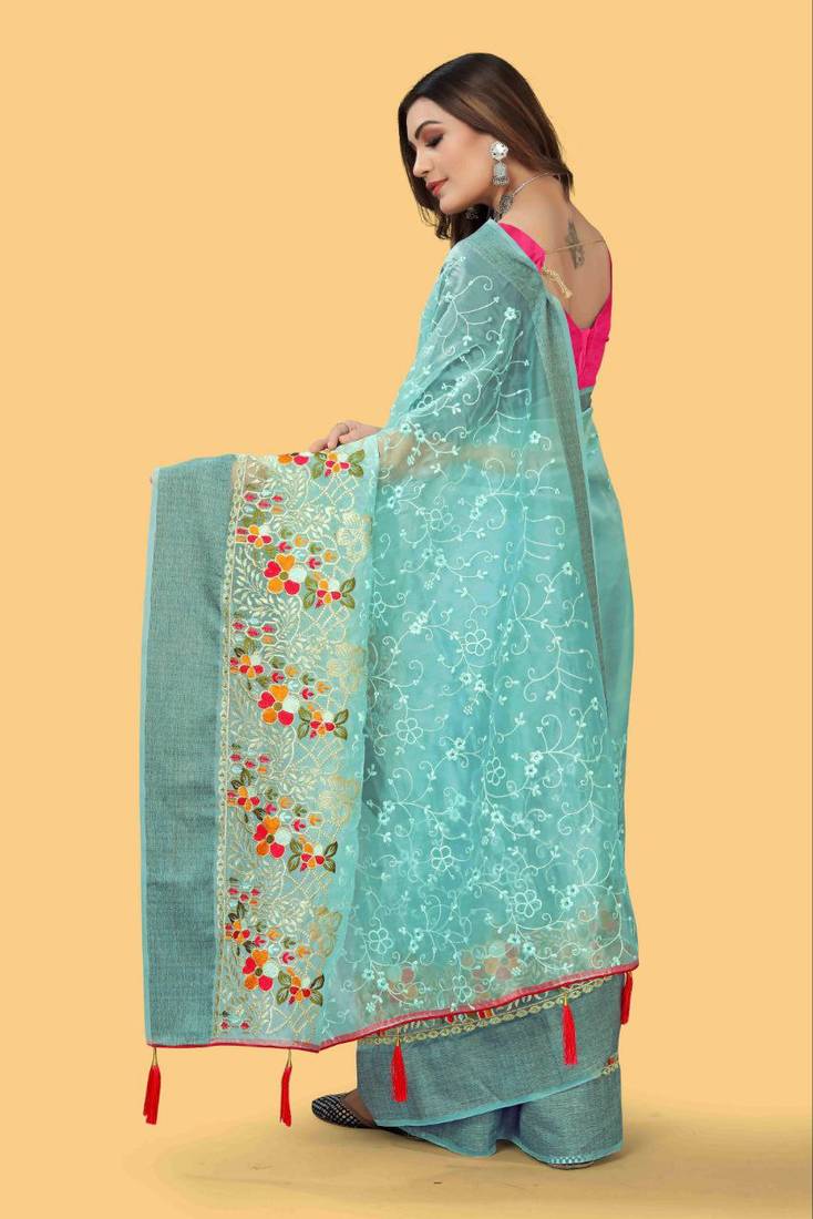 | Product Name | Sky Blue Color Embroidered Organza Silk Saree | |