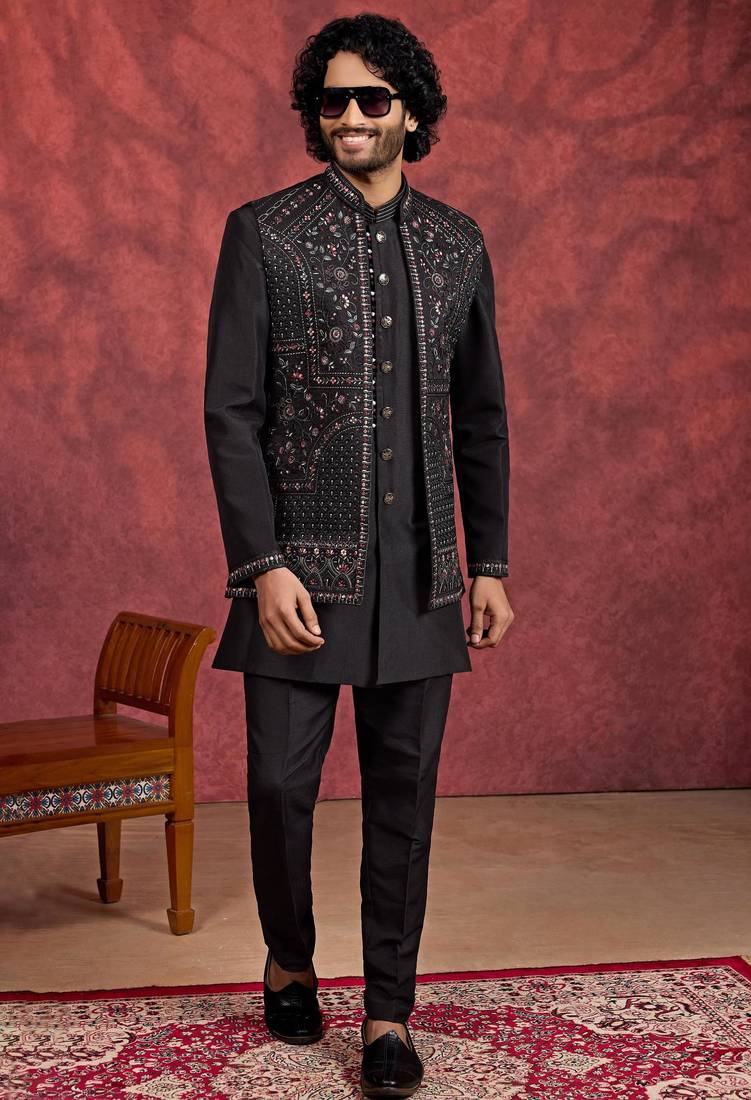 | Product Name | Black Art Silk 3 Piece Indo Jacket Set For Men | |
