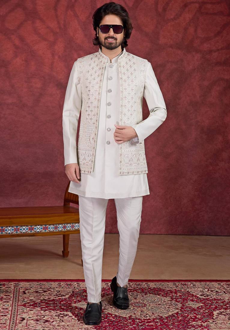 | Product Name | Off White Art Silk 3 Piece Indo Jacket Set For Men | |