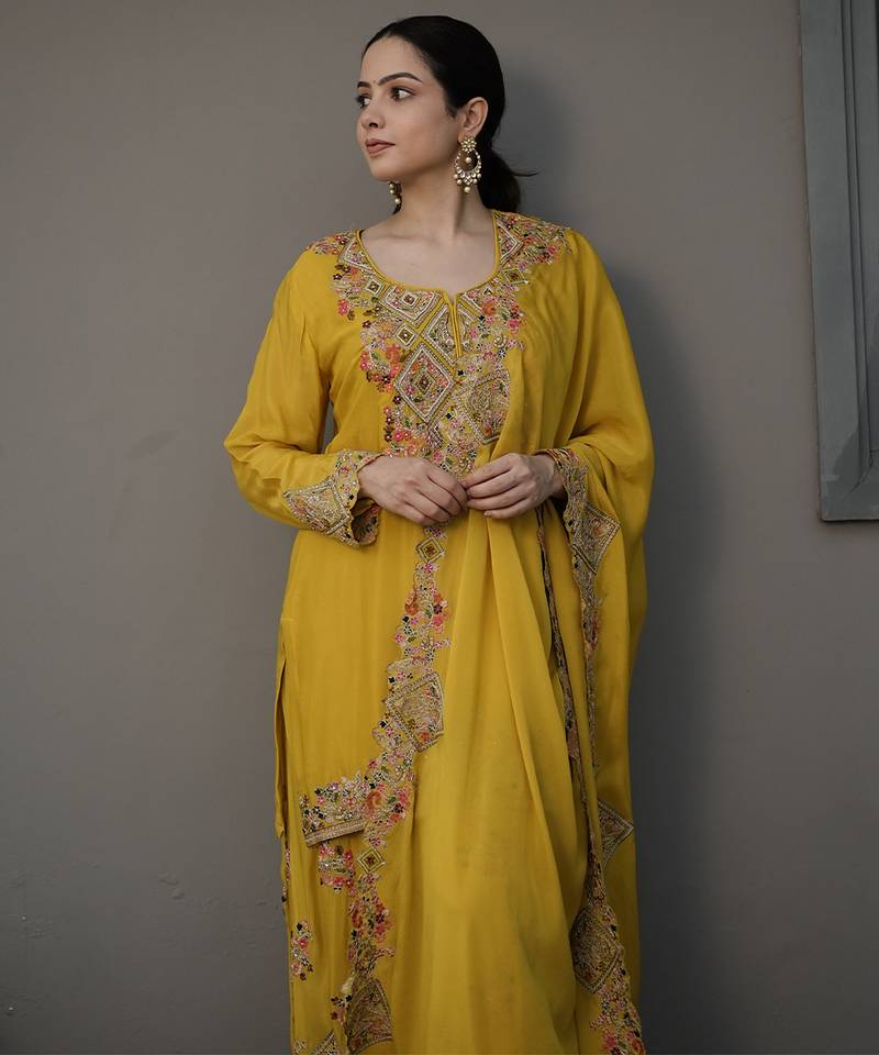 | Product Description | This Yellow Embroidered Chiffon Sharara Set Exudes Fresh Elegance And Festive Charm. Crafted From Lightweight Chiffon Fabric, It Features Intricate Embroidery That Adds A Graceful, Airy Touch. Perfect For Weddings And Celebrations, It Offers A Flowing Silhouette With Timeless Traditional Appeal.