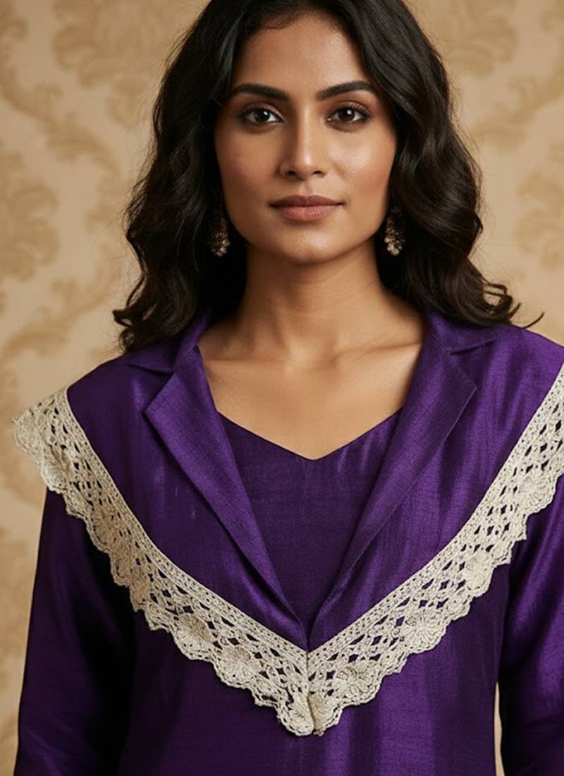 | Product Description | A Chic And Contemporary Three Piece Ethnic Ensemble In Deep Purple. This Set Features A Long Kurta Top Crafted From Smooth Vichitra Silk, Paired With Stylish Dhoti Pants. The Look Is Elevated By A Distinct 15 Inch Cape Style Jacket Adorned With Intricate Gold Lace Borders. Top Length: 45 Inches Bottom Length: 37 Inches Cape/Jacket Length: 15 Inches |