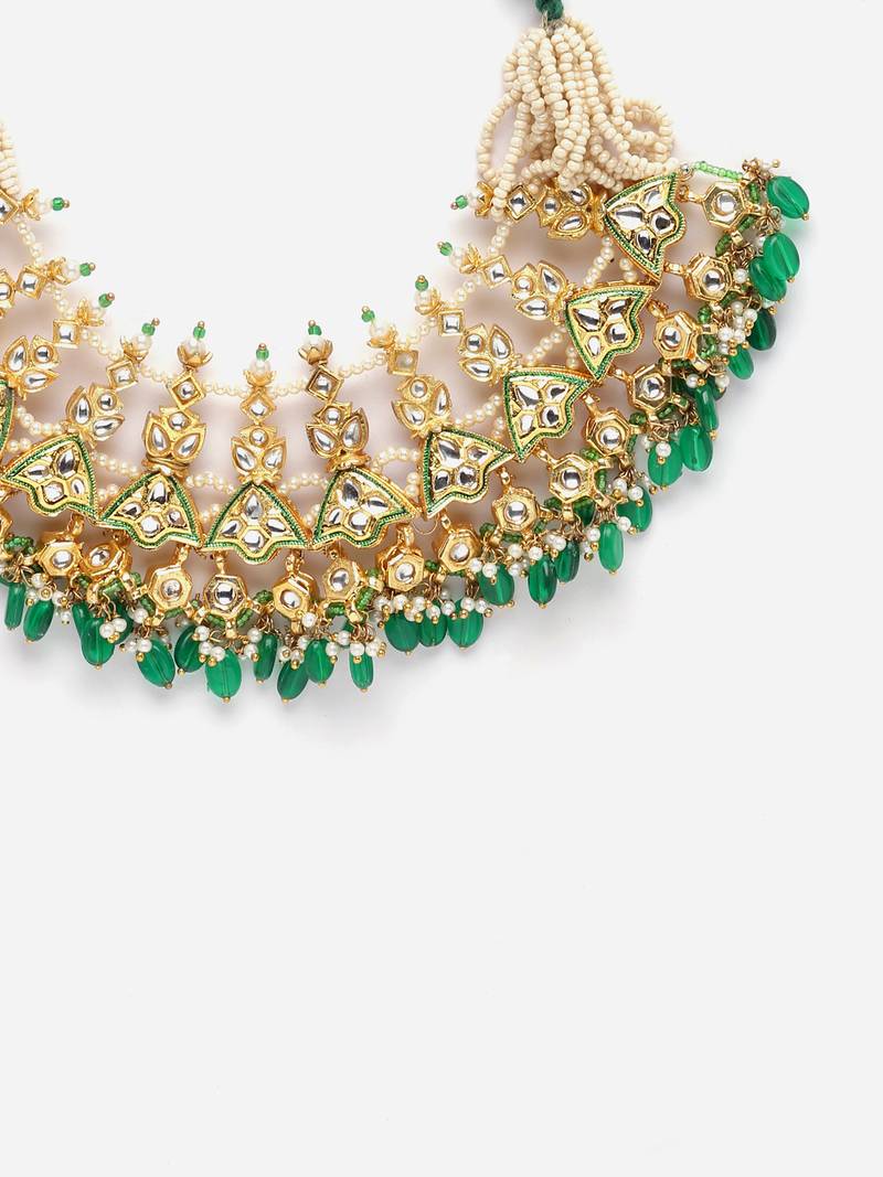 | Product Description | Andcrafted Kundan And Tinch Of Pearl And Green Makes This Pc Unique And Stylish; Category Of Jewellery Is Necklace; Sub Category Is Haar; Ideal For Women; Color Is Green, Gold, Cream, White; Gemstones Used Kundan, Pearls, Natural Stones, Faux Emerald; Plating Is Gold Plated; Base Metal Is Alloy; Other Material Used Adjustable Dori; Size Is Freesize; Adjustable Yes; Weight Is 118 Gms; Mesaurements Length Of Necklace =40 Cm; Width Of Necklace = 6 Cm; Adjustable Yes; Content 1 Necklace |