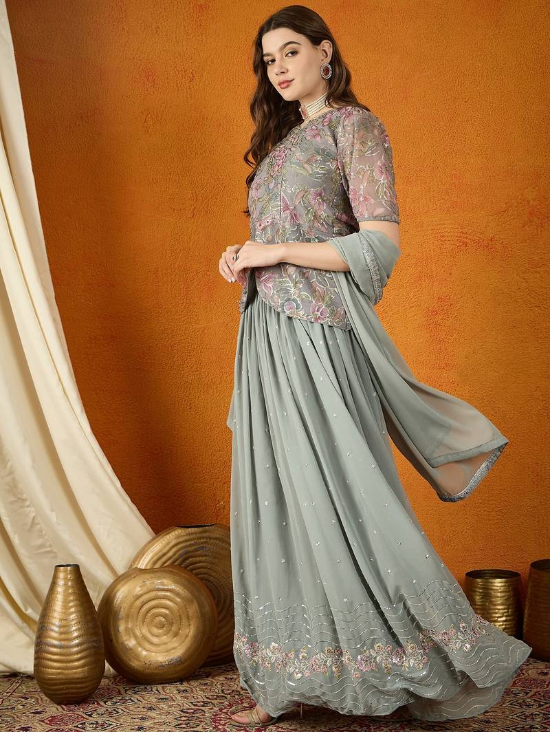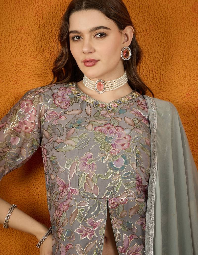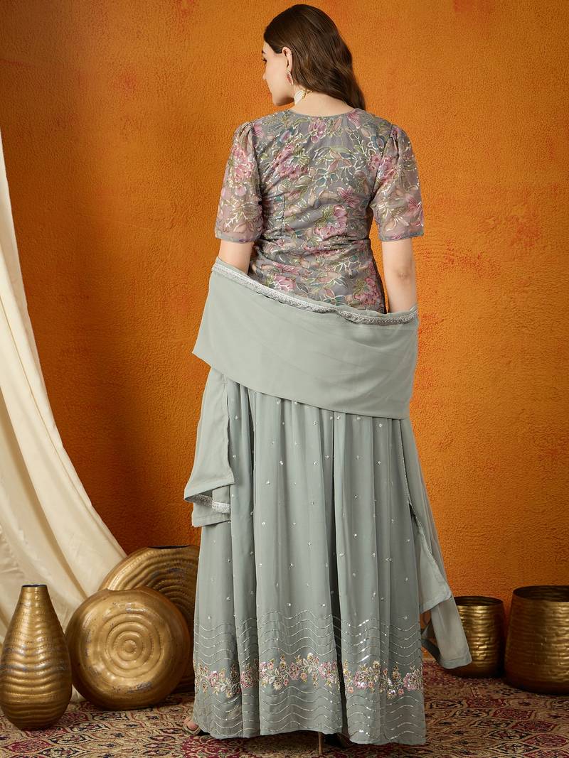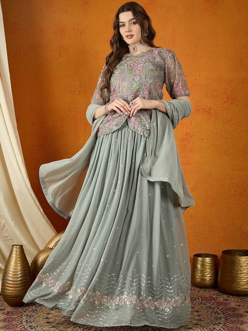 Grey faux georgette anarkali style long choli readymade lehenga