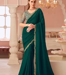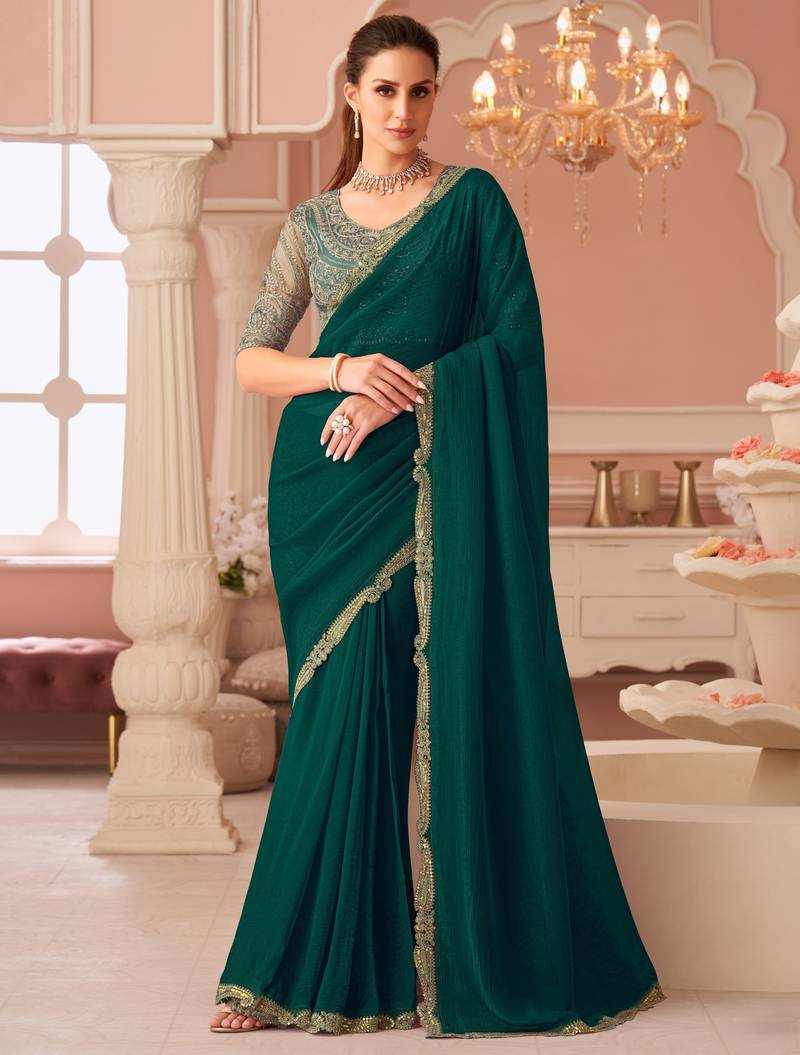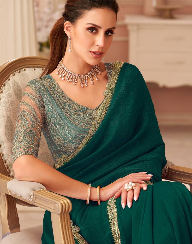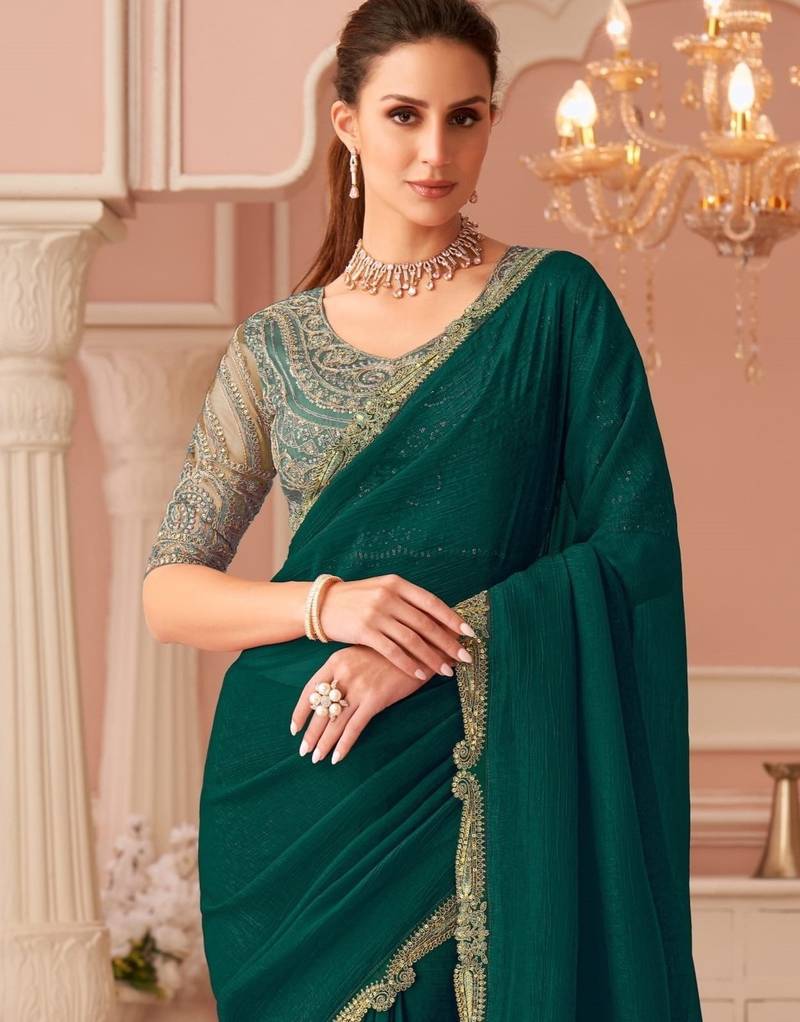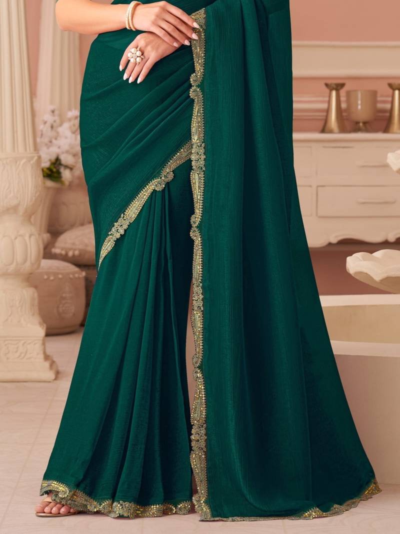 Green georgette saree with heavy embroidered blouse and designer lace border for weddings, festive celebrations