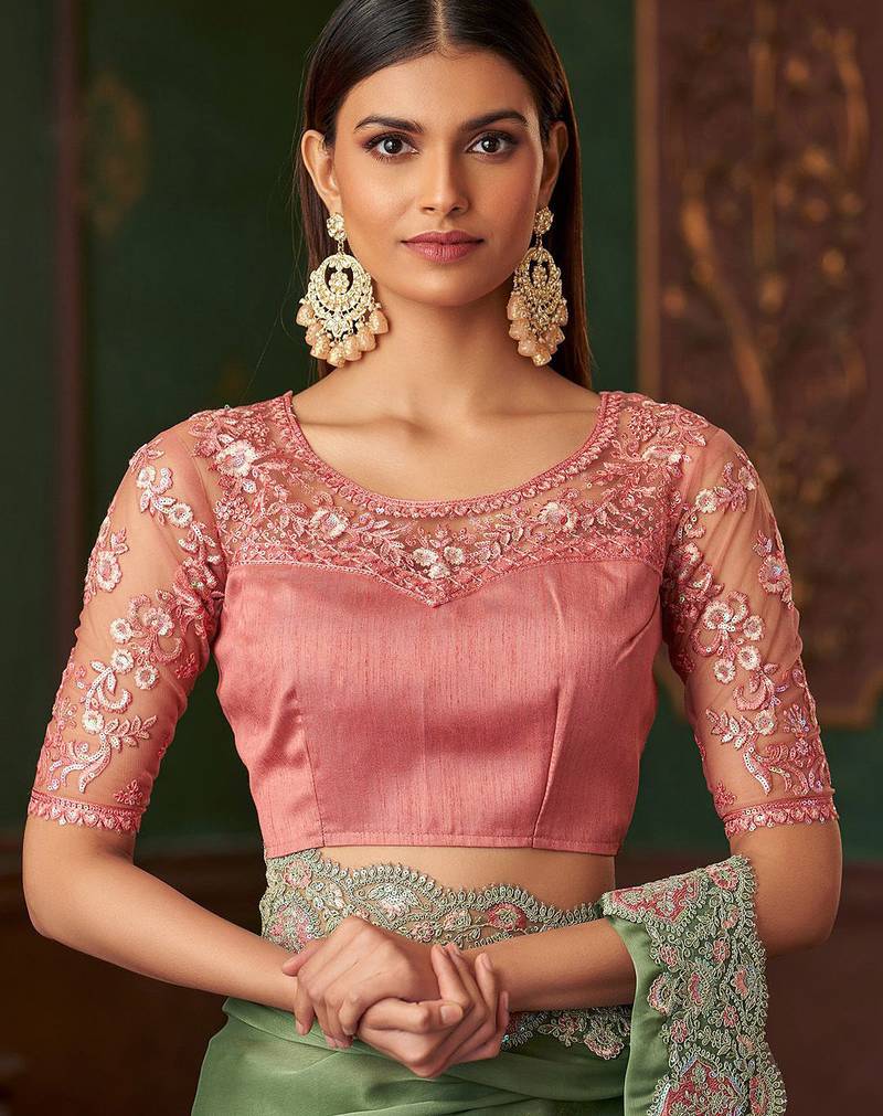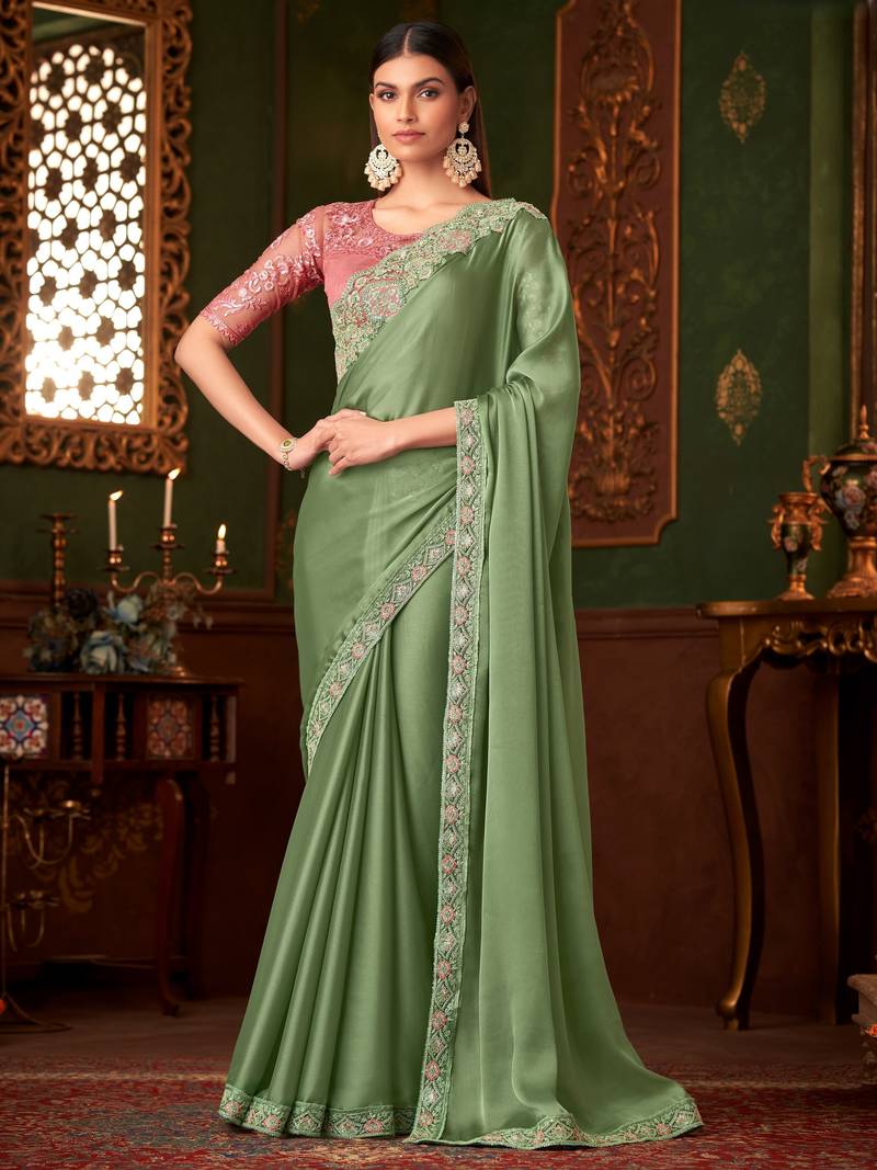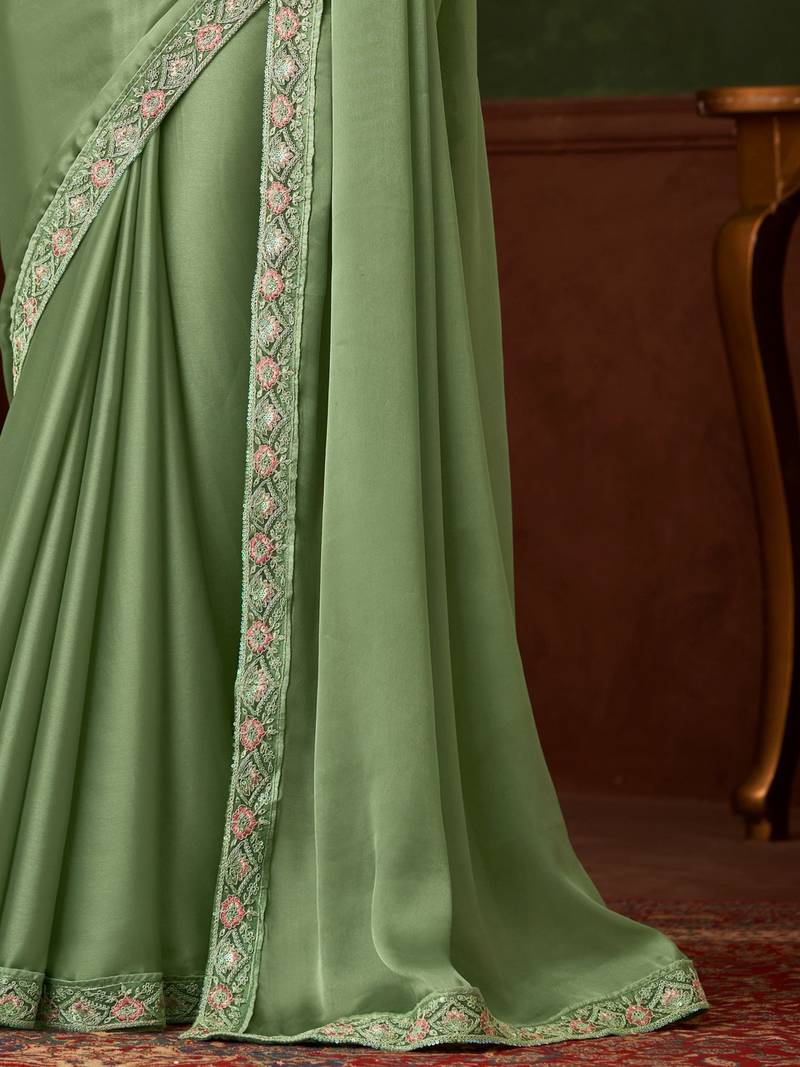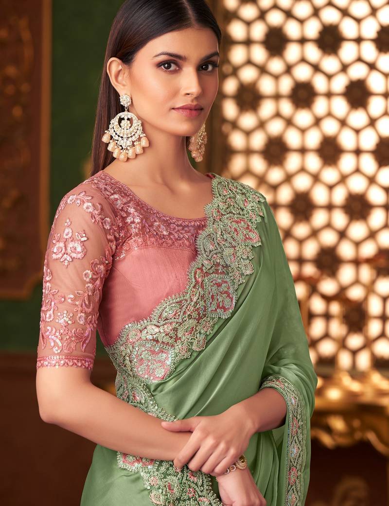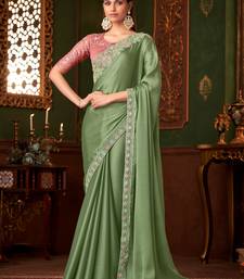 Green satin saree, lace border with heavy embroidered blouse for special occasions