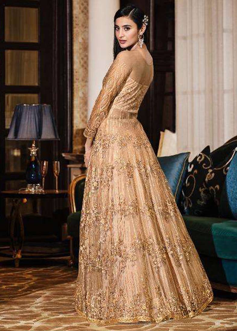 | Product Description | This Golden Gown Is Designed In Soft Premium Net And Features Detailed Embroidery Work Across The Bodice And Skirt. The Upper Portion Includes Dense Thread Embroidery Extending From The Neckline To The Waist Area. The Neckline And Sheer Long Sleeves Are Finished With Coordinated Embroidered Detailing. The Floor Length Skirt Has A Flared Silhouette With Heavy Embroidery Distributed Throughout The Net Layer, Forming Defined Patterns Along The Surface And Hemline. A Matching Golden Net Dupatta Accompanies The Set With A Subtle Finished Edge. This Semi Stitched Set Includes The Embroidered Net Gown, A Crepe Bottom, And A Coordinating Golden Dupatta, All Designed To Complement The Overall Embroidered Detailing. |