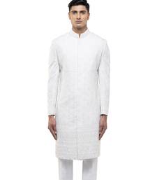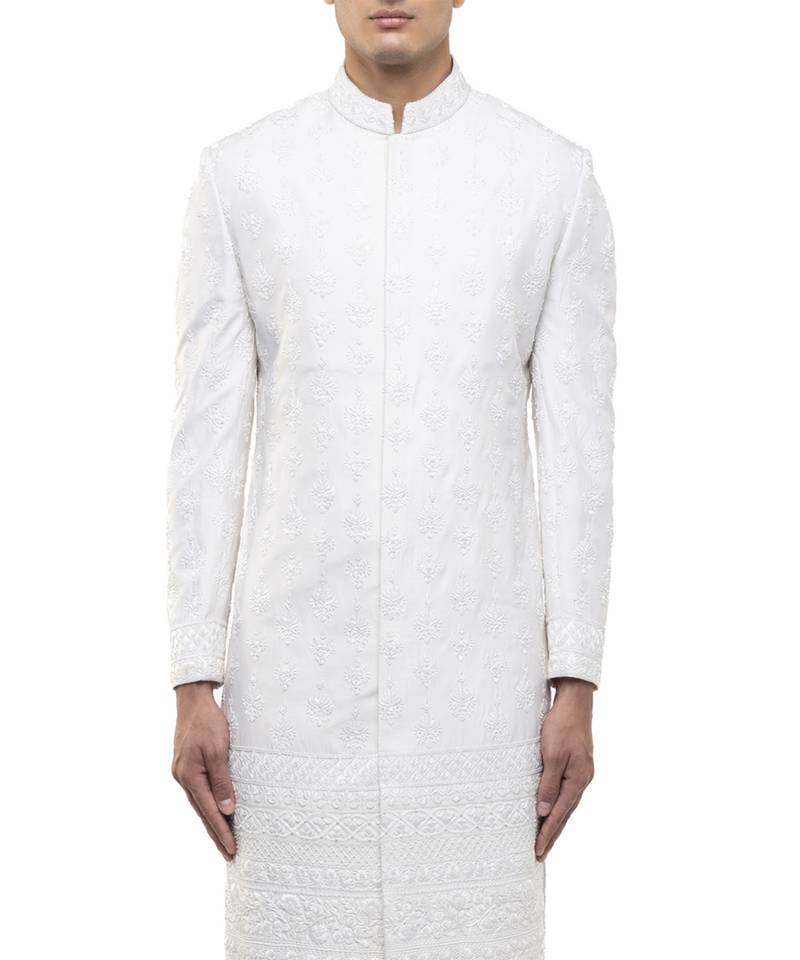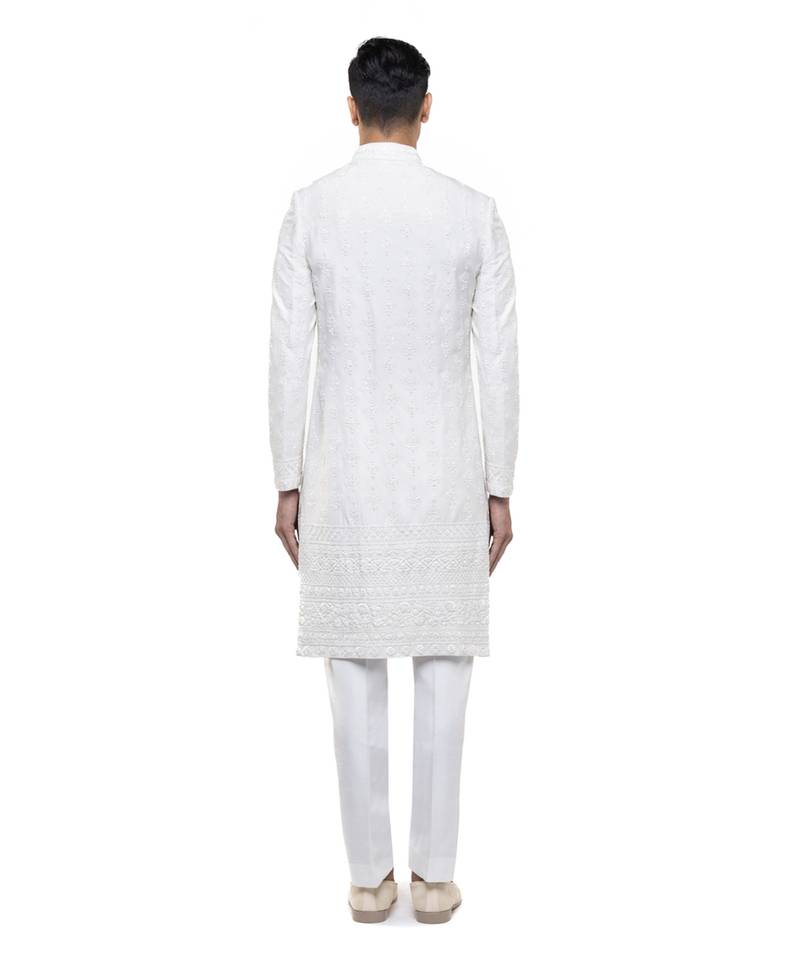 This White Embroidered Silk Sherwani Set Showcases Regal Elegance And Timeless Craftsmanship. Crafted From Luxurious Silk Fabric, It Features Intricate Embroidery That Adds A Rich, Sophisticated Touch. Ideal For Weddings And Grand Festive Occasions, It Offers A Majestic Silhouette, Premium Comfort, And Classic Ethnic Appeal.