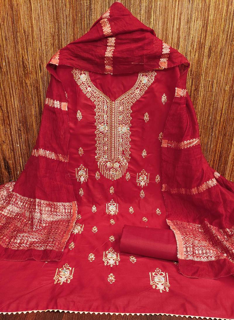 | Product Description | Ready To Ship Heavy Thread Embroidery And Fancy Border With Designer Dupatta Straight Style 2.00 Mtr Unstitched Dress Material Top Of Red Colour Pc Cotton Fabric Also Including 2.00 Mtr Chudidar Style Bottom Piece Material Of Red Colour Cotton Fabric With 2.00 Mtr Dupatta Of Red Colour Cotton Fabric By Shadow & Saining Brand |