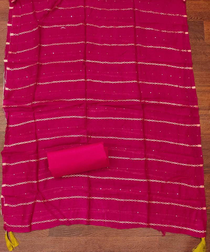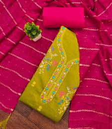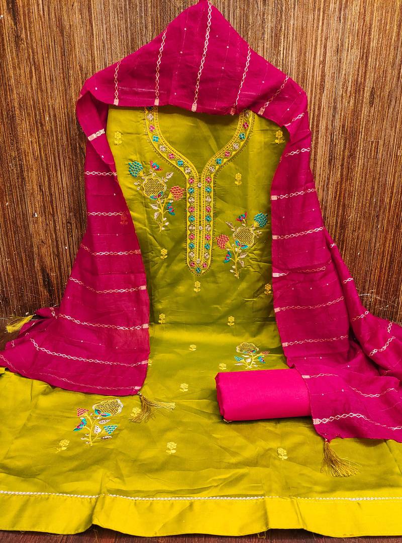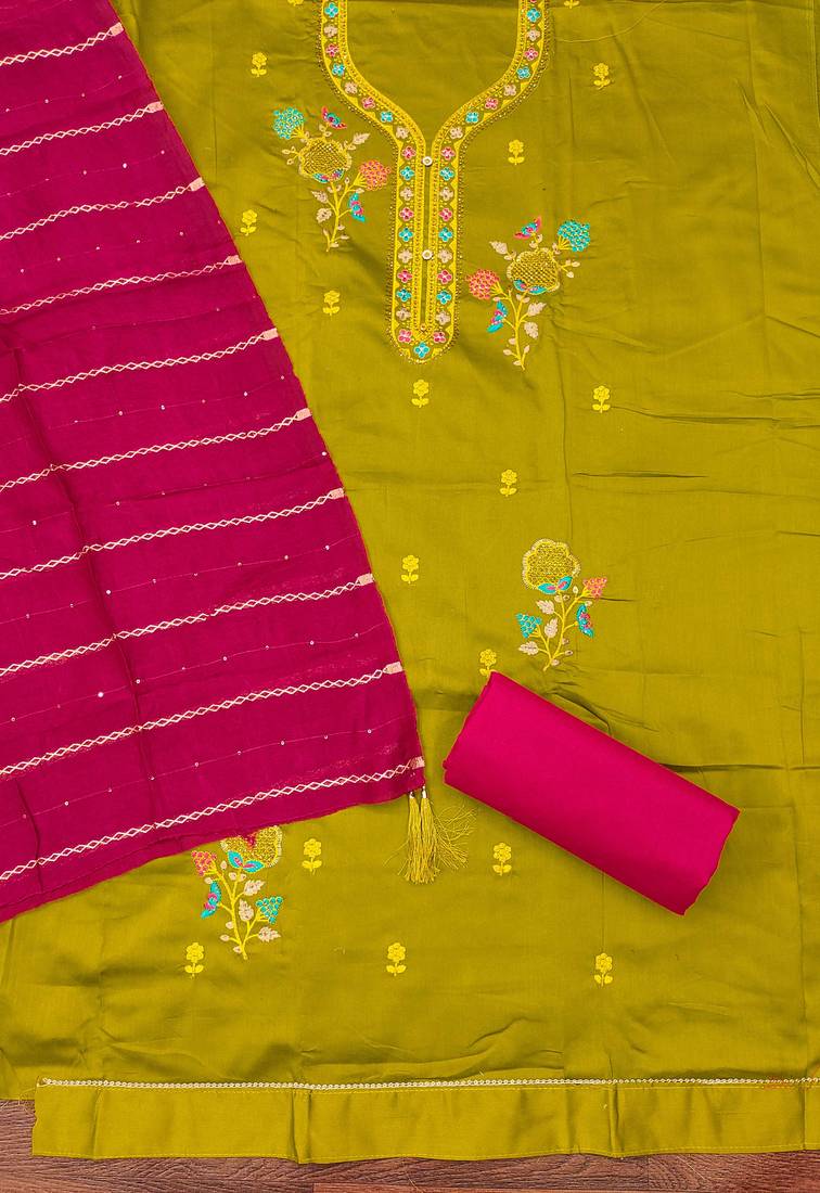| Product Description | Versatile Heavy Multi Thread Embroidery, Daimond And Fancy Border With Designer Dupatta Straight Style 2.00 Mtr Unstitched Dress Material Top Of Mehandi Colour Jaam Cotton Fabric With 2 Mtr Semi Leon As Lining Inner Fabric Also Including 3.80 Mtr Unstiched Bottom Material Of Magenta Colour Semi Leon Fabric With 2.00 Mtr Dupatta Of Magenta Colour Chanderi Fabric By Shadow & Saining Brand |