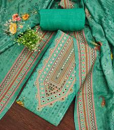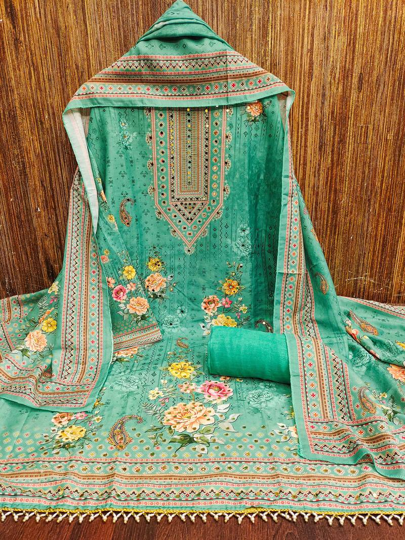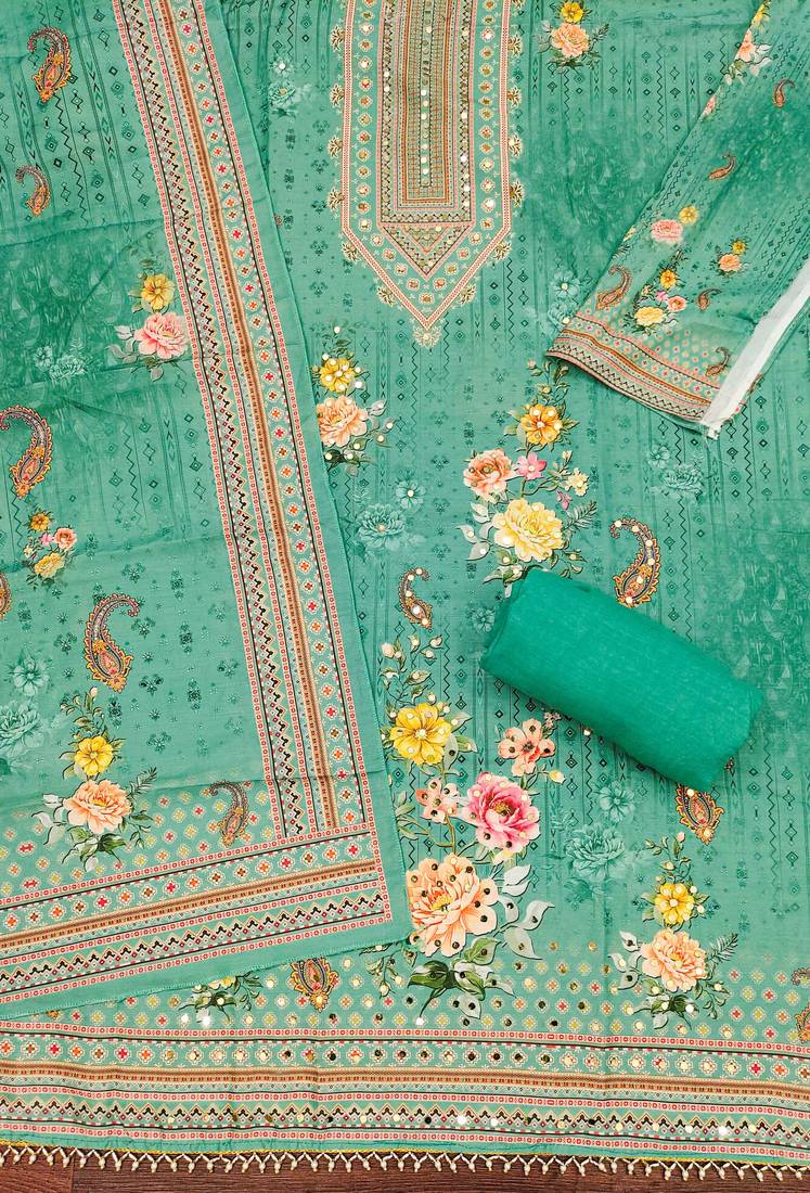 | Product Description | Ethereal Designer Print, Mirror Work And Fancy Border With Stylish Printed Dupatta Straight Style 2.00 Mtr Unstitched Dress Material Top Of Green Colour Muslin Cotton Fabric Also Including 2.00 Mtr Chudidar Style Bottom Piece Material Of Green Colour Rayon Fabric With 2.00 Mtr Dupatta Of Green Colour Muslin Cotton Fabric By Shadow & Saining Brand |