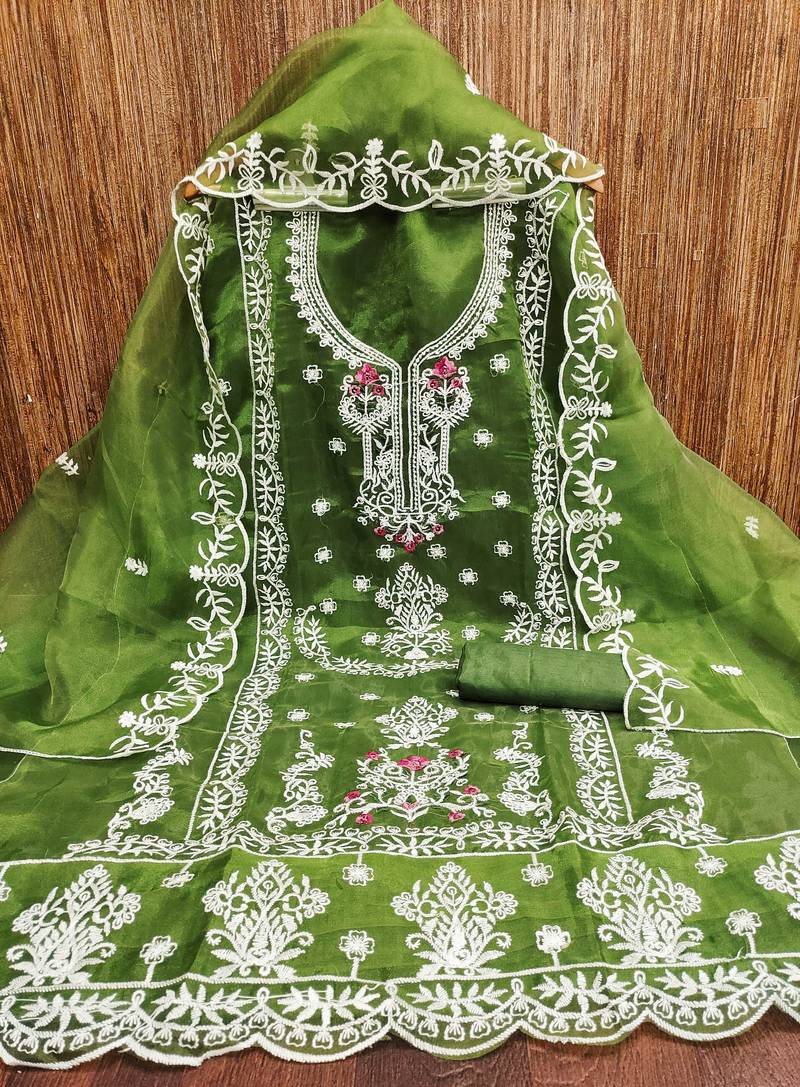 Green embroidered organza semiStitched churidar dress-materials semi stitched