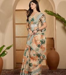 Beige floral digital print linen zari saree with belt zari border lightweight festive saree