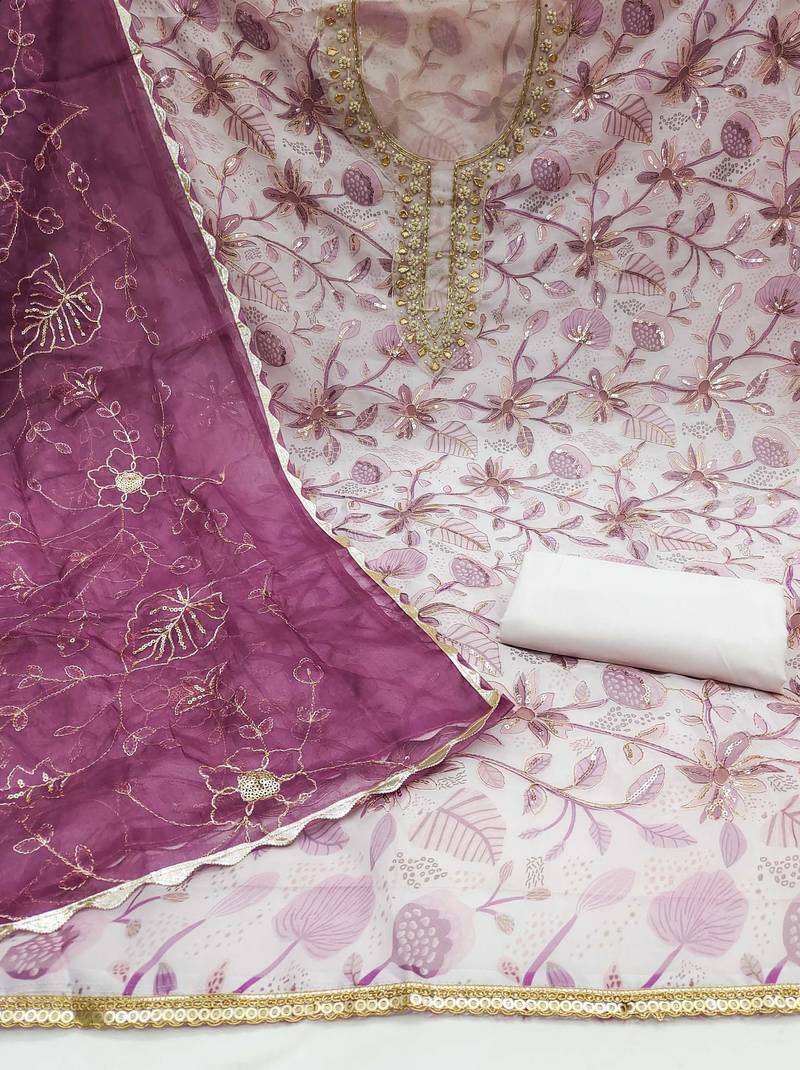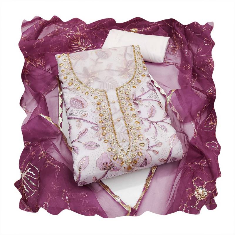 Soft Touch Heavy Thread Sequence Digital Position Print Embroidery Handwork Neck And Fancy Border With Designer Embroidered Dupatta Straight Style 2.20 Mtr Unstitched Dress Material Top Of Cream Colour Viscose Organja Fabric With 2 Mtr Dull Santoon As Lining Inner Fabric Also Including 3.80 Mtr Unstiched Bottom Material Of Cream Colour Dull Santoon Fabric With 2.10 Mtr Dupatta Of Cream Colour Organja Fabric By Shadow & Saining Brand