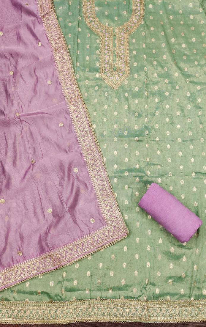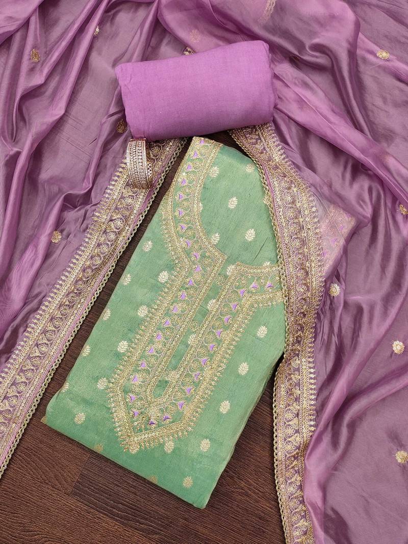 | Product Description | Charming Designer Jari Weaving Work With Fancy Embroidery Work And Heavy Embroidery With Stylish Border Dupatta Work Straight Style 2.40 Mtr Unstitched Dress Material Top Of Green Colour Simmer Silk Fabric Also Including 2.50 Mtr Chudidar Style Bottom Piece Material Of Lavender Colour Reyon Fabric With 2.40 Mtr Dupatta Of Lavender Colour Heavy Organza Fabric By Shadow & Saining Brand |
