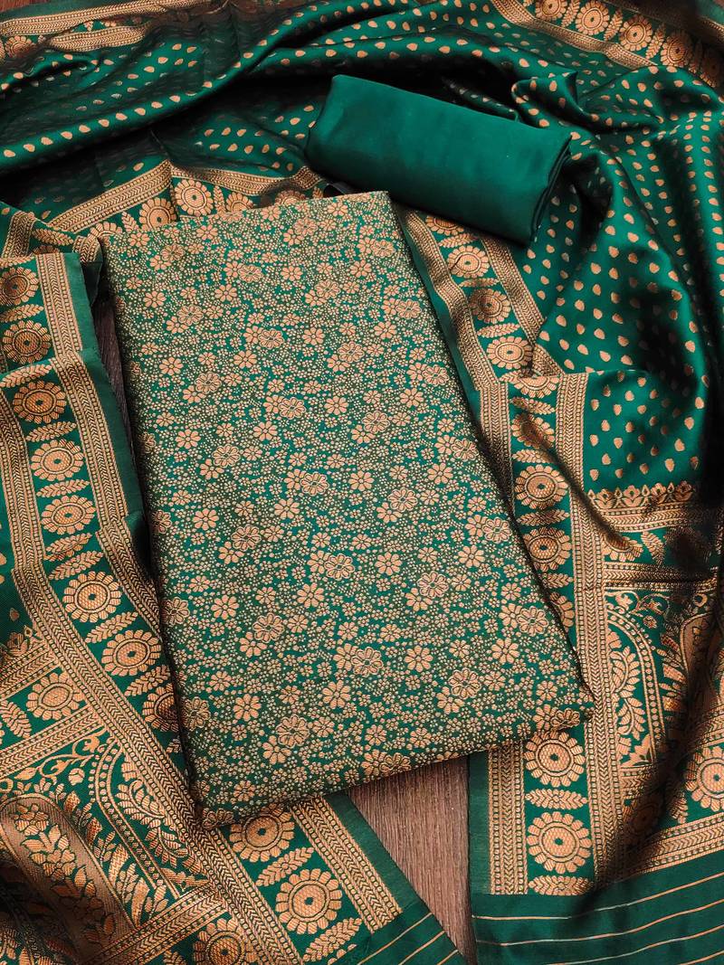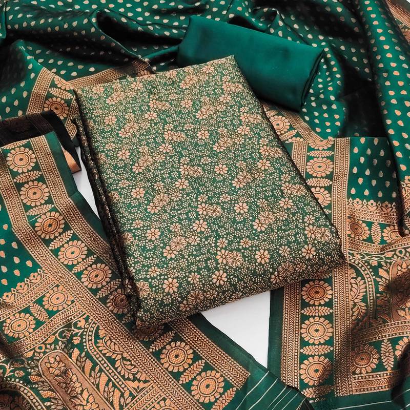| Product Description | Fancy Heavy Zari Weaving Work Work And Jacquard Work Dupatta Straight Style 2.00 Mtr Unstitched Dress Material Top Of Green Colour Jacquard Silk Fabric Also Including 2.00 Mtr Chudidar Style Bottom Piece Material Of Green Colour Silk Blend Fabric With 2.25 Mtr Dupatta Of Green Colour Banarasi Jacquard Fabric By Shadow & Saining Brand |
