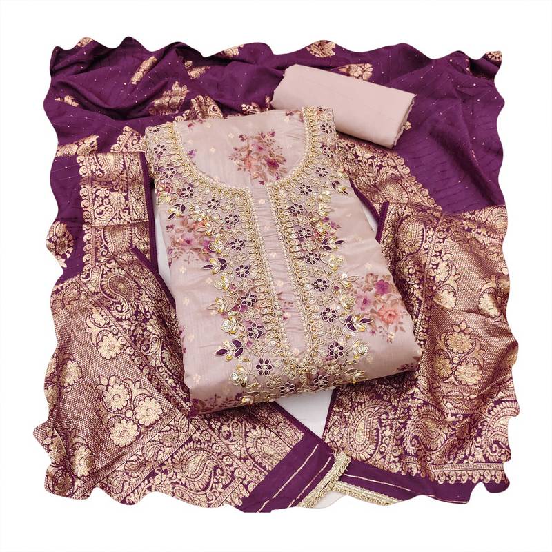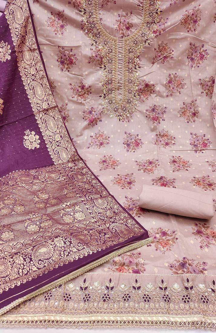 | Product Description | Elegant Designer Weaving Digital Print Handwork And Fancy Border With Stylish Woven Dupatta Straight Style 2.00 Mtr Unstitched Dress Material Top Of Grey Colour Mal Chanderi Fabric With 2 Mtr Dull Santoon As Lining Inner Fabric Also Including 3.80 Mtr Unstiched Bottom Material Of Grey Colour Dull Santoon Fabric With 2.10 Mtr Dupatta Of Purple Colour Soft Chanderi Banarasi Fabric By Shadow & Saining Brand |