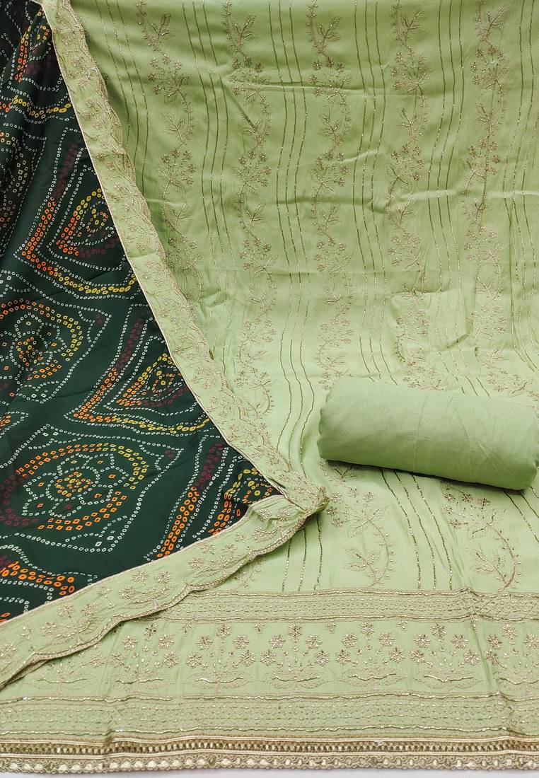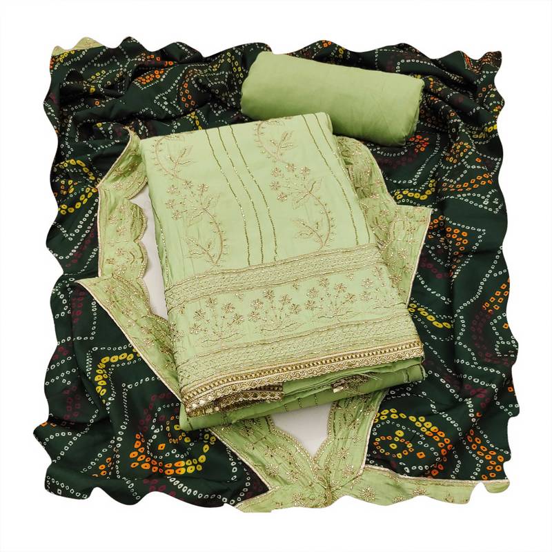 | Product Description | Artisanal Heavy Thread Handwork Embroidery And Fancy Border With Designer Bandhani Printed Dupatta Straight Style 2.20 Mtr Unstitched Dress Material Top Of Light Green Colour Premium Roman Cotton Fabric Also Including 2.40 Mtr Chudidar Style Bottom Piece Material Of Light Green Colour Rayon Fabric With 2.10 Mtr Dupatta Of Green Colour Muslin Fabric By Shadow & Saining Brand |