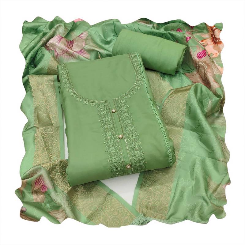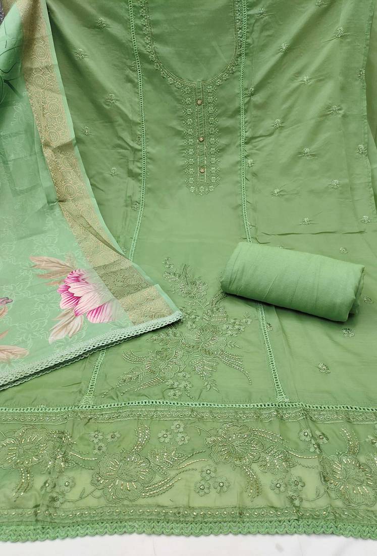 | Product Description | Office Ready Heavy Thread Embroidery Handwork And Fancy Border With Designer Digital Printed Dupatta Straight Style 2.20 Mtr Unstitched Dress Material Top Of Light Green Colour Glass Organja Fabric Also Including 2.40 Mtr Chudidar Style Bottom Piece Material Of Light Green Colour Rayon Fabric With 2.10 Mtr Dupatta Of Multi Colour Muslin Banarasi Fabric By Shadow & Saining Brand |