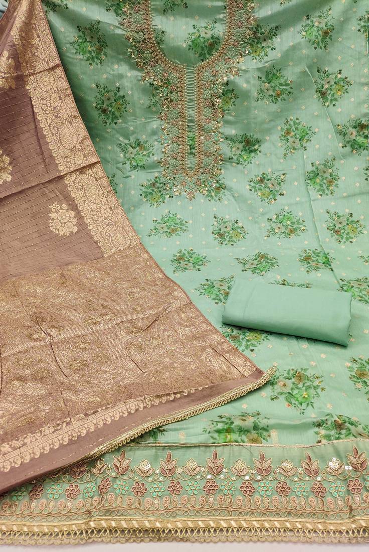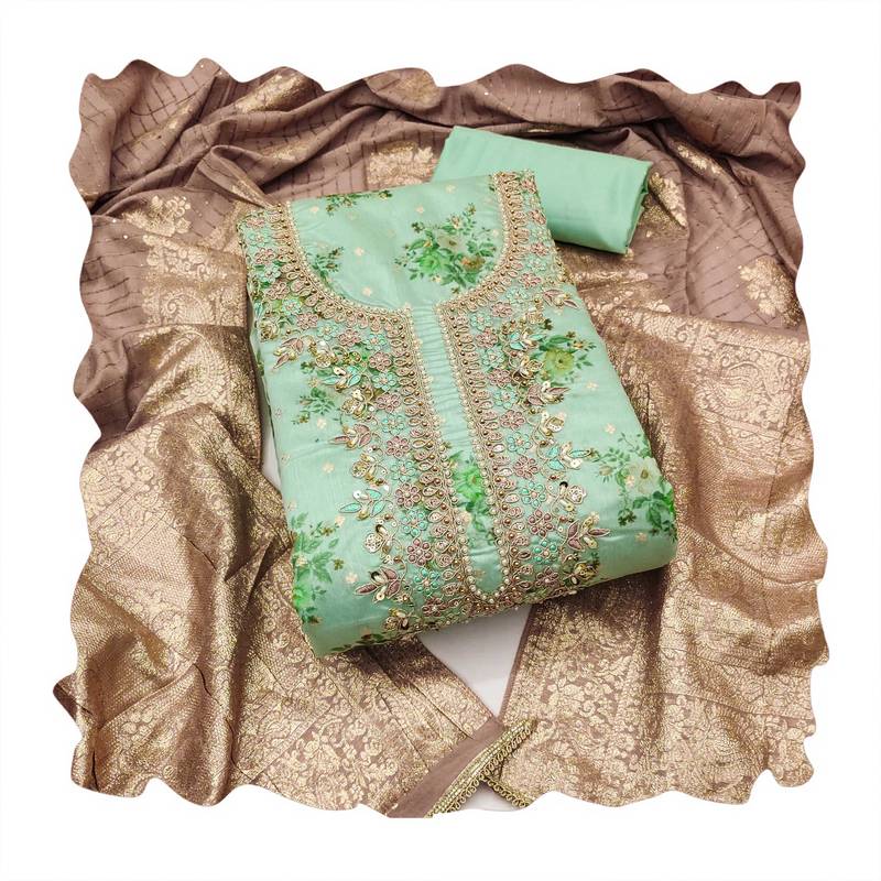 | Product Description | Premium Designer Weaving Digital Print Handwork And Fancy Border With Stylish Woven Dupatta Straight Style 2.00 Mtr Unstitched Dress Material Top Of Light Green Colour Mal Chanderi Fabric With 2 Mtr Dull Santoon As Lining Inner Fabric Also Including 3.80 Mtr Unstiched Bottom Material Of Light Green Colour Dull Santoon Fabric With 2.10 Mtr Dupatta Of Grey Colour Soft Chanderi Banarasi Fabric By Shadow & Saining Brand |