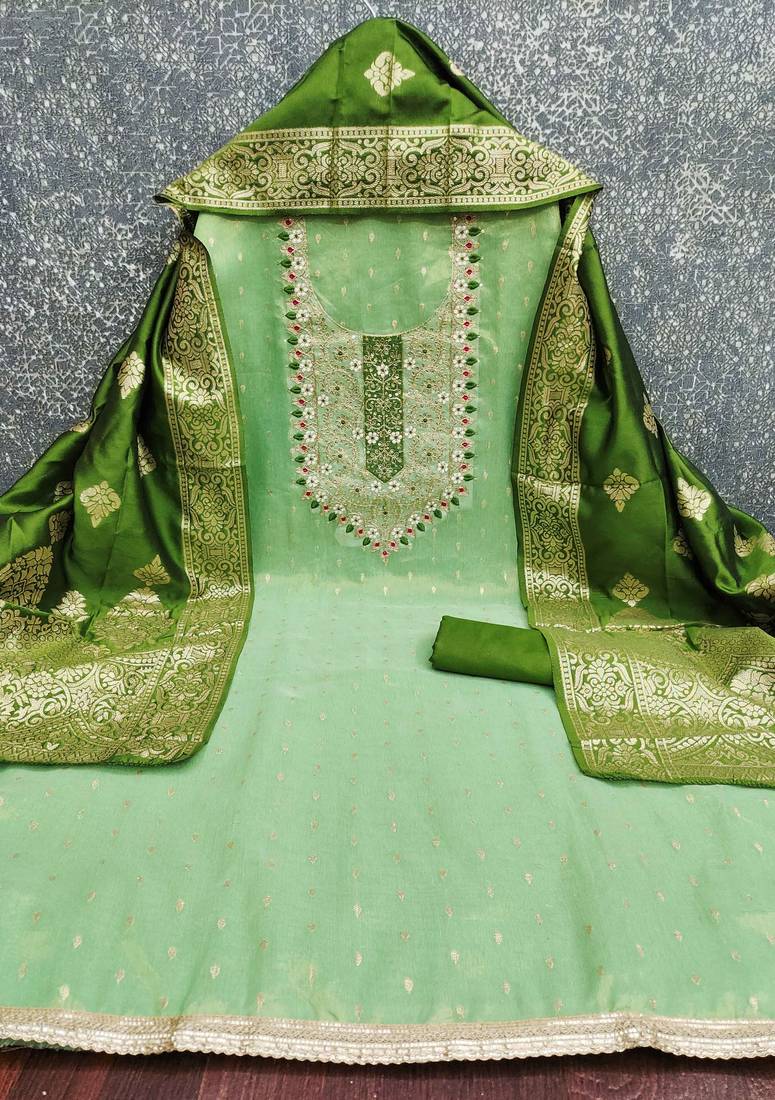 | Product Description | Timeless Designer Weaving Handwork And Fancy Border With Stylish Woven Dupatta Straight Style 2.00 Mtr Unstitched Dress Material Top Of Light Green Colour Simmar Fabric With 2 Mtr Santoon As Lining Inner Fabric Also Including 3.60 Mtr Unstiched Bottom Material Of Green Colour Santoon Fabric With 2.00 Mtr Dupatta Of Green Colour Jacquard Fabric By Shadow & Saining Brand |