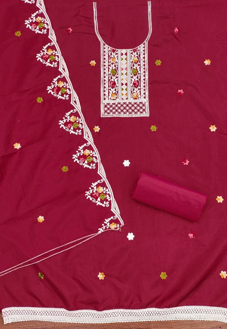 | Product Description | Sophisticated Heavy Thread Sequence Embroidery And Fancy Border With Embroidered Dupatta Straight Style 2.00 Mtr Unstitched Dress Material Top Of Maroon Colour Cotton Fabric Also Including 2.00 Mtr Chudidar Style Bottom Piece Material Of Maroon Colour Cotton Fabric With 2.00 Mtr Dupatta Of Maroon Colour Cotton Fabric By Shadow & Saining Brand |