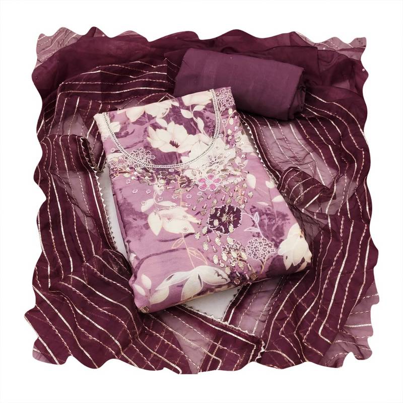 | Product Description | Skin Friendly Designer Print Handwork Embroidery And Fancy Border With Stylish Embroidered Dupatta Straight Style 2.20 Mtr Unstitched Dress Material Top Of Multi Colour Pure Cotton Silk Fabric Also Including 2.40 Mtr Chudidar Style Bottom Piece Material Of Deep Voilet Colour Rayon Fabric With 2.10 Mtr Dupatta Of Deep Voilet Colour Organja Fabric By Shadow & Saining Brand |