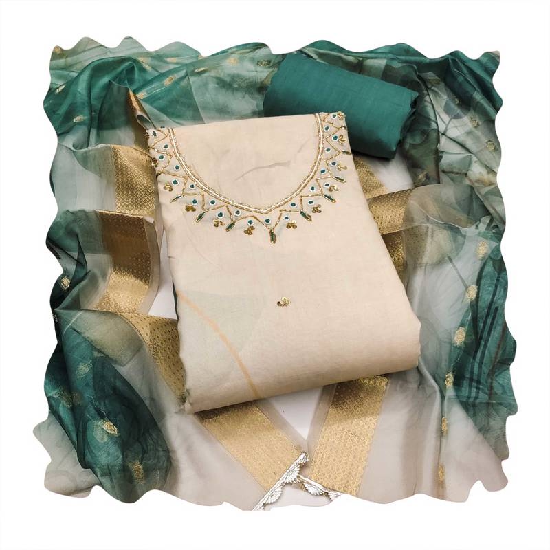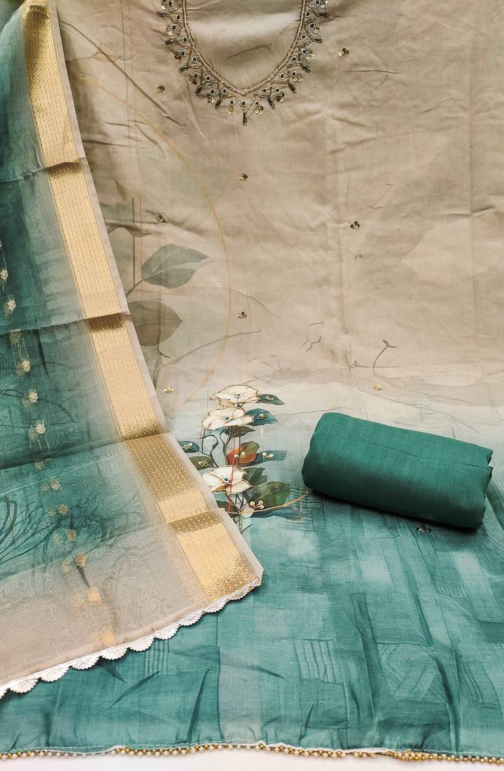 | Product Description | Office Ready Designer Digital Print Handwork And Fancy Border With Stylish Woven Dupatta Straight Style 2.00 Mtr Unstitched Dress Material Top Of Multi Colour Cemric Cotton Fabric Also Including 2.40 Mtr Chudidar Style Bottom Piece Material Of Green Colour Rayon Fabric With 2.10 Mtr Dupatta Of Multi Colour Soft Banarasi Fabric By Shadow & Saining Brand |