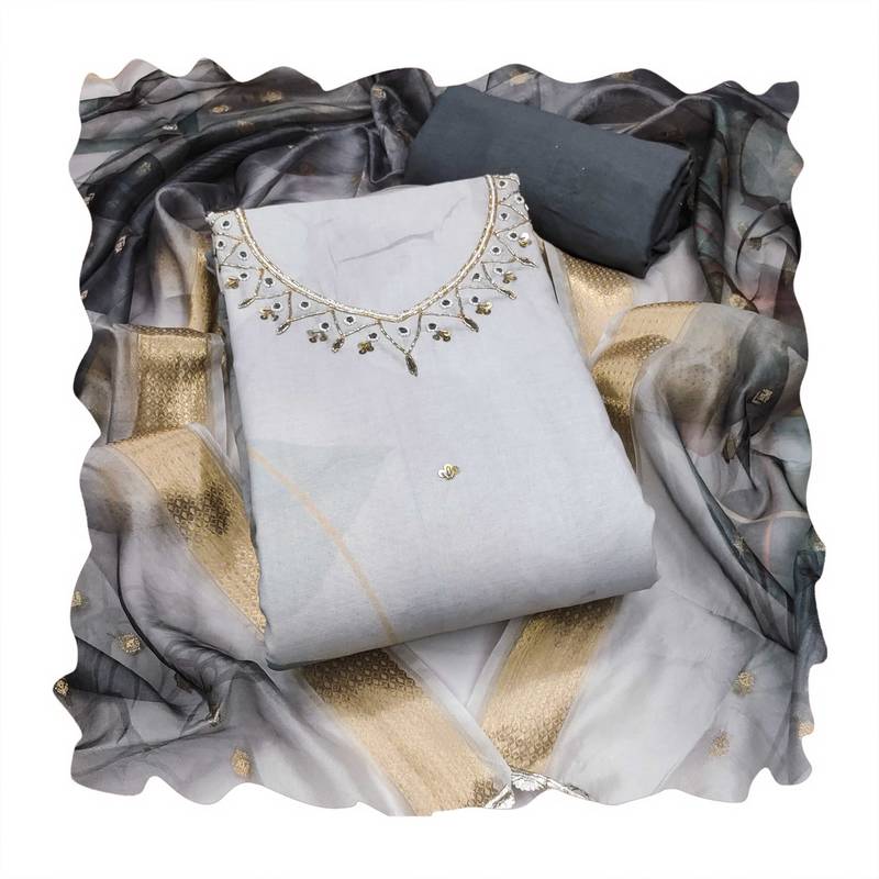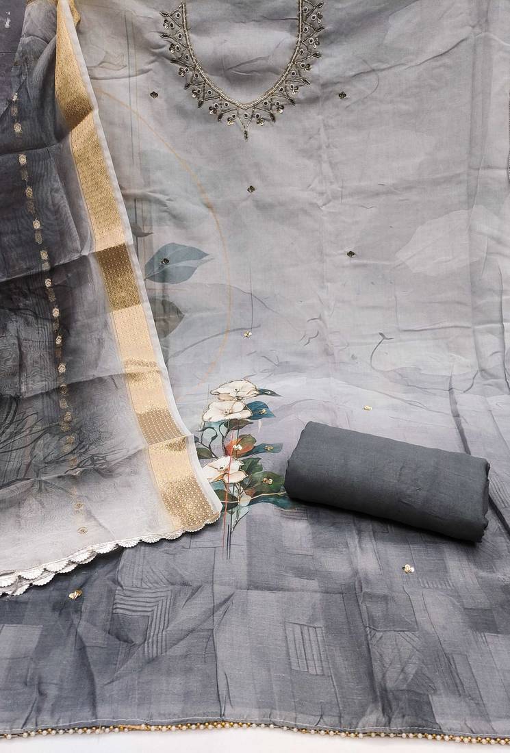 | Product Description | Wedding Perfect Designer Digital Print Handwork And Fancy Border With Stylish Woven Dupatta Straight Style 2.00 Mtr Unstitched Dress Material Top Of Multi Colour Cemric Cotton Fabric Also Including 2.40 Mtr Chudidar Style Bottom Piece Material Of Grey Colour Rayon Fabric With 2.10 Mtr Dupatta Of Multi Colour Soft Banarasi Fabric By Shadow & Saining Brand |