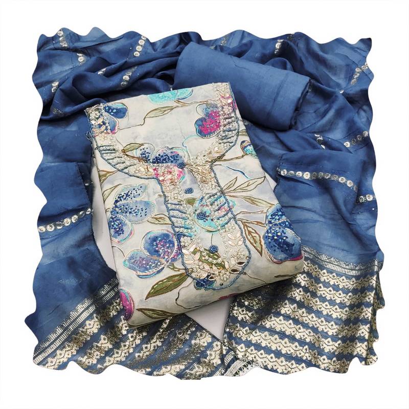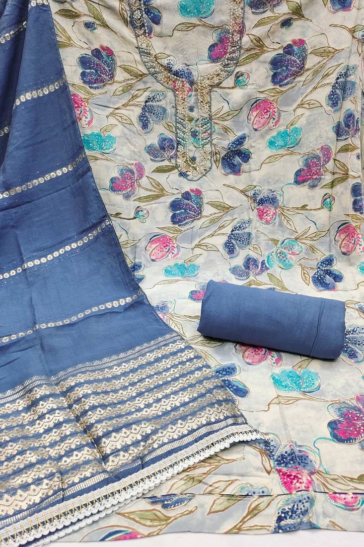 | Product Description | Chic Designer Digital Print Handwork And Fancy Border With Stylish Woven Dupatta Straight Style 2.00 Mtr Unstitched Dress Material Top Of Multi Colour Jam Cotton Fabric Also Including 2.40 Mtr Chudidar Style Bottom Piece Material Of Grey Colour Rayon Fabric With 2.10 Mtr Dupatta Of Grey Colour Soft Chanderi Banarasi Fabric By Shadow & Saining Brand |