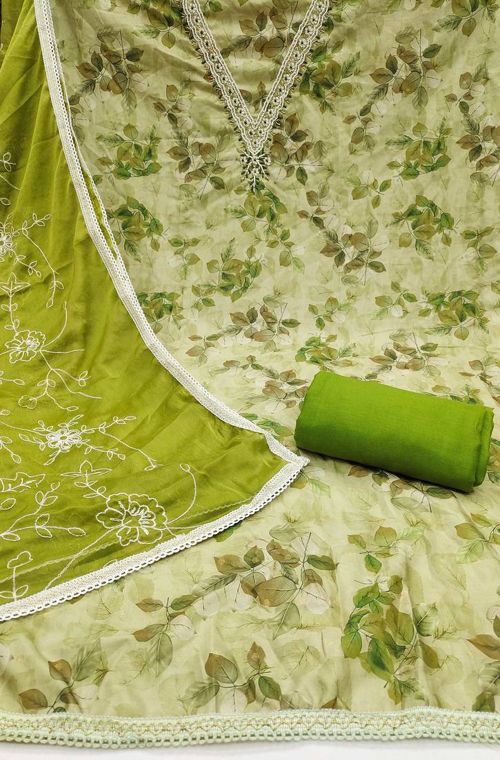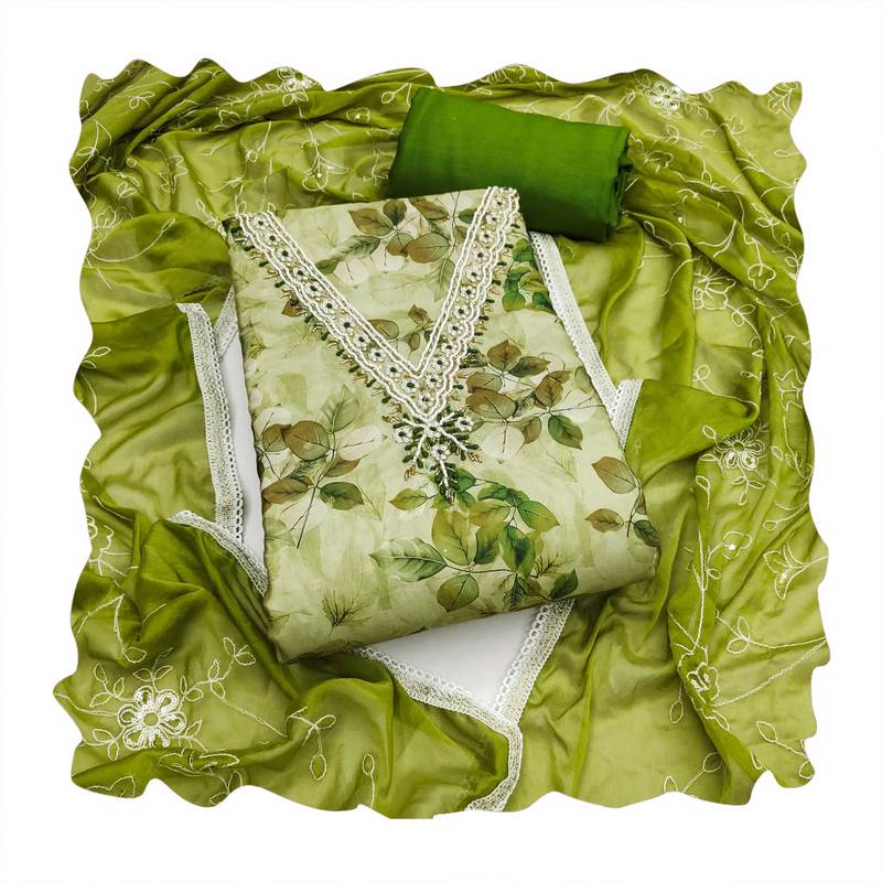 | Product Description | Skin Friendly Heavy Digital Print Handwork Neck And Fancy Border With Embroidered Dupatta Straight Style 2.00 Mtr Unstitched Dress Material Top Of Multi Colour Banarasi Cotton Fabric Also Including 2.40 Mtr Chudidar Style Bottom Piece Material Of Green Colour Rayon Fabric With 2.10 Mtr Dupatta Of Green Colour Nazneen Fabric By Shadow & Saining Brand |