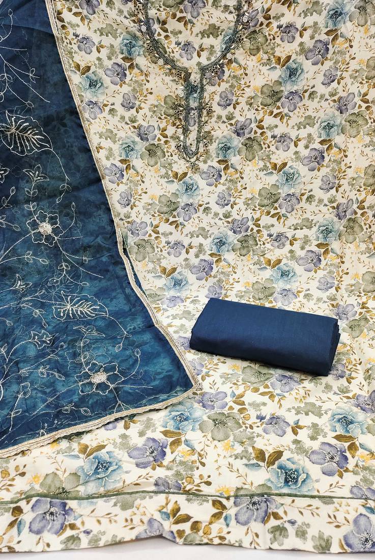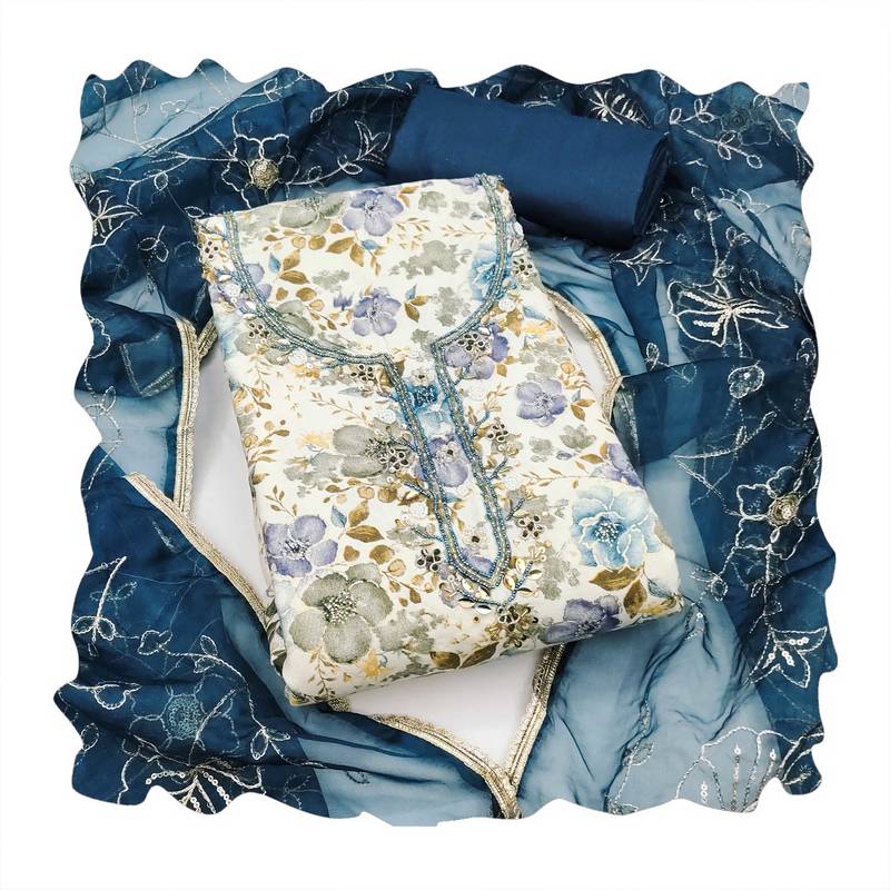 | Product Description | Curated Designer Digital Print Handwork And Fancy Border With Stylish Embrodiered Dupatta Straight Style 2.00 Mtr Unstitched Dress Material Top Of Multi Colour Jam Cotton Fabric Also Including 2.40 Mtr Chudidar Style Bottom Piece Material Of Blue Colour Pure Cotton Fabric With 2.10 Mtr Dupatta Of Blue Colour Pure Organja Fabric By Shadow & Saining Brand |