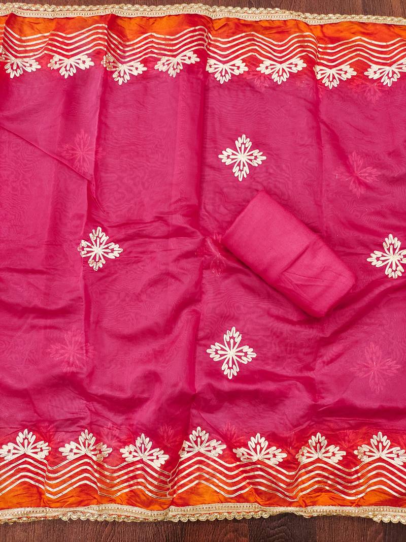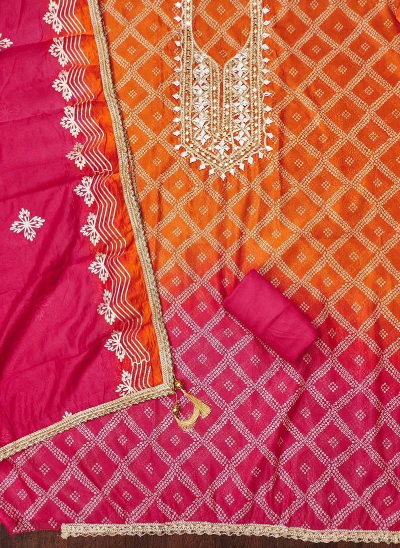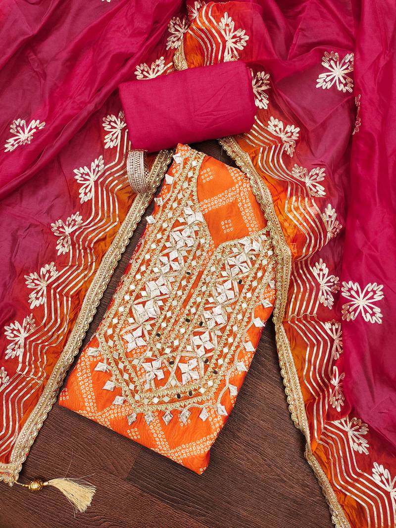 | Product Description | Stylish Bandhani Leheriya Digital Print With Heavy Gota Patti Neck Work With Border Work Along Designer Gota Pati With Digital Printed Dupatta Work Straight Style 2.40 Mtr Unstitched Dress Material Top Of Orange Colour Heavy Organza Fabric Also Including 2.50 Mtr Chudidar Style Bottom Piece Material Of Pink Colour Reyon Fabric With 2.40 Mtr Dupatta Of Multi Colour Heavy Organza Fabric By Shadow & Saining Brand |
