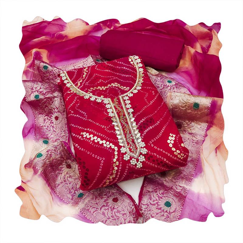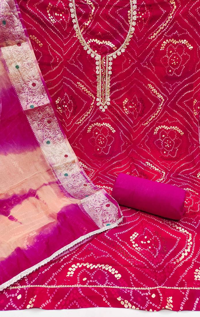 | Product Description | Party Perfect Designer Bandhani Print Handwork And Fancy Border With Stylish Saburi Printed Dupatta Straight Style 2.00 Mtr Unstitched Dress Material Top Of Pink Colour Jam Cotton Fabric Also Including 2.40 Mtr Chudidar Style Bottom Piece Material Of Pink Colour Rayon Fabric With 2.10 Mtr Dupatta Of Pink Colour Banarasi Organja Fabric By Shadow & Saining Brand |