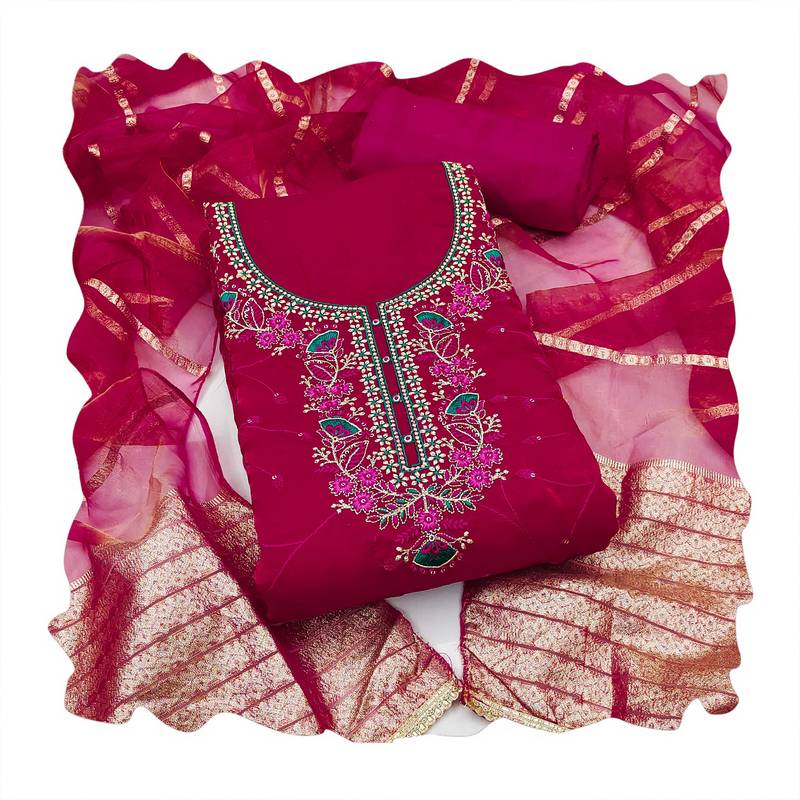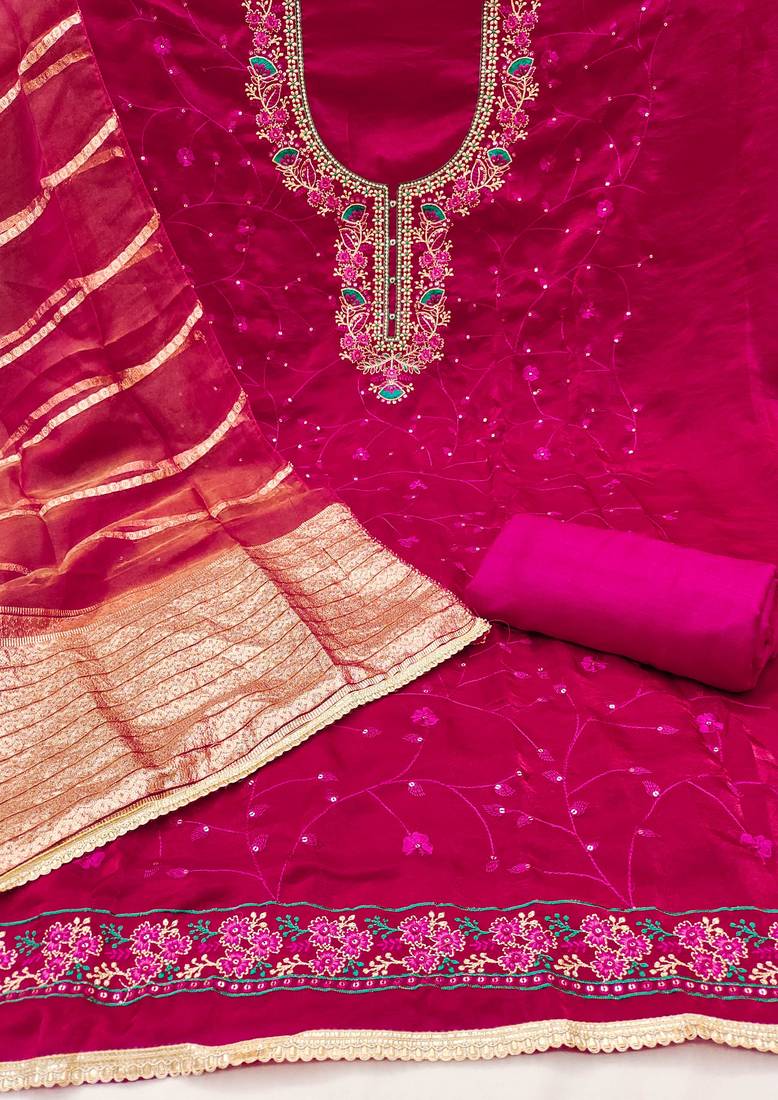 Skin Friendly Heavy Thread Sequence Zari Embroidery And Fancy Border With Designer Woven Dupatta Straight Style 2.20 Mtr Unstitched Dress Material Top Of Pink Colour Fandy Silk Fabric Also Including 2.40 Mtr Chudidar Style Bottom Piece Material Of Pink Colour Rayon Fabric With 2.10 Mtr Dupatta Of Pink Colour Simmer Banarasi Fabric By Shadow & Saining Brand
