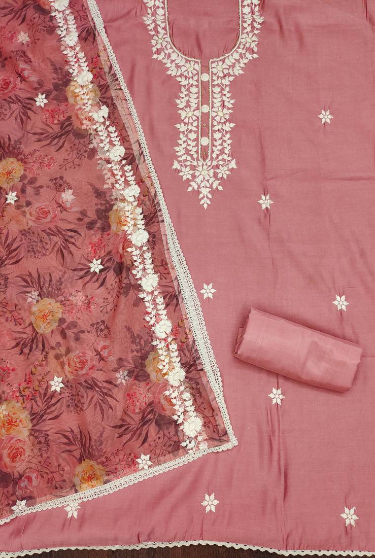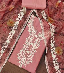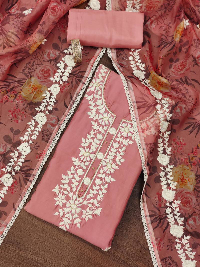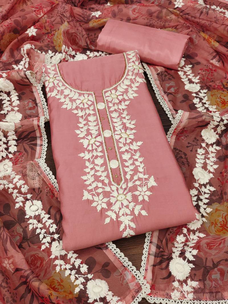 Pink thread embroidery silk blend semi stitched churidar dress-materials
