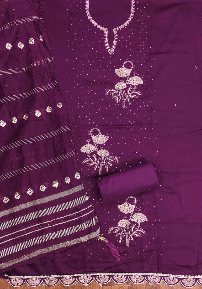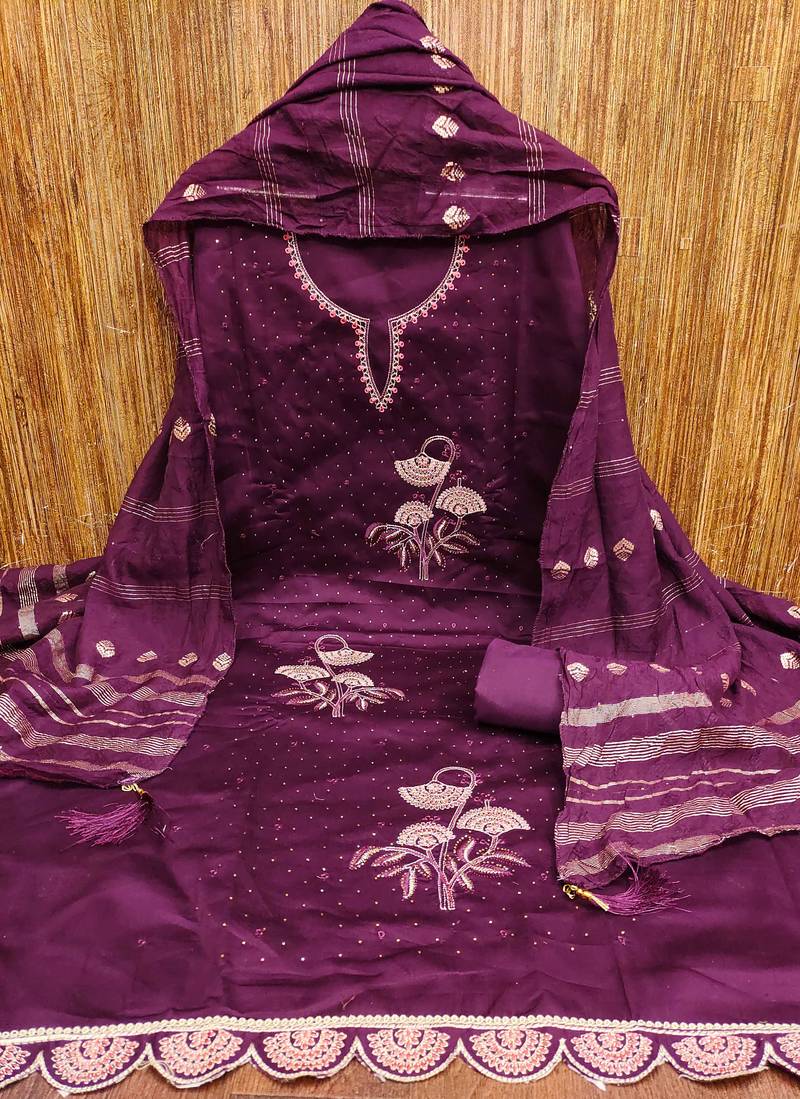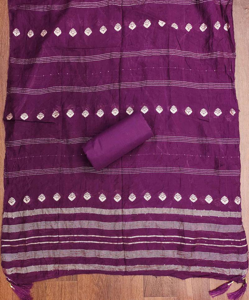 | Product Description | Premium Heavy Thread Daimond Embroidery And Fancy Border With Designer Weaving Dupatta Straight Style 2.00 Mtr Unstitched Dress Material Top Of Purple Colour Jaam Cotton Fabric Also Including 2.00 Mtr Chudidar Style Bottom Piece Material Of Purple Colour Cotton Fabric With 2.00 Mtr Dupatta Of Purple Colour Chanderi Cotton Fabric By Shadow & Saining Brand |