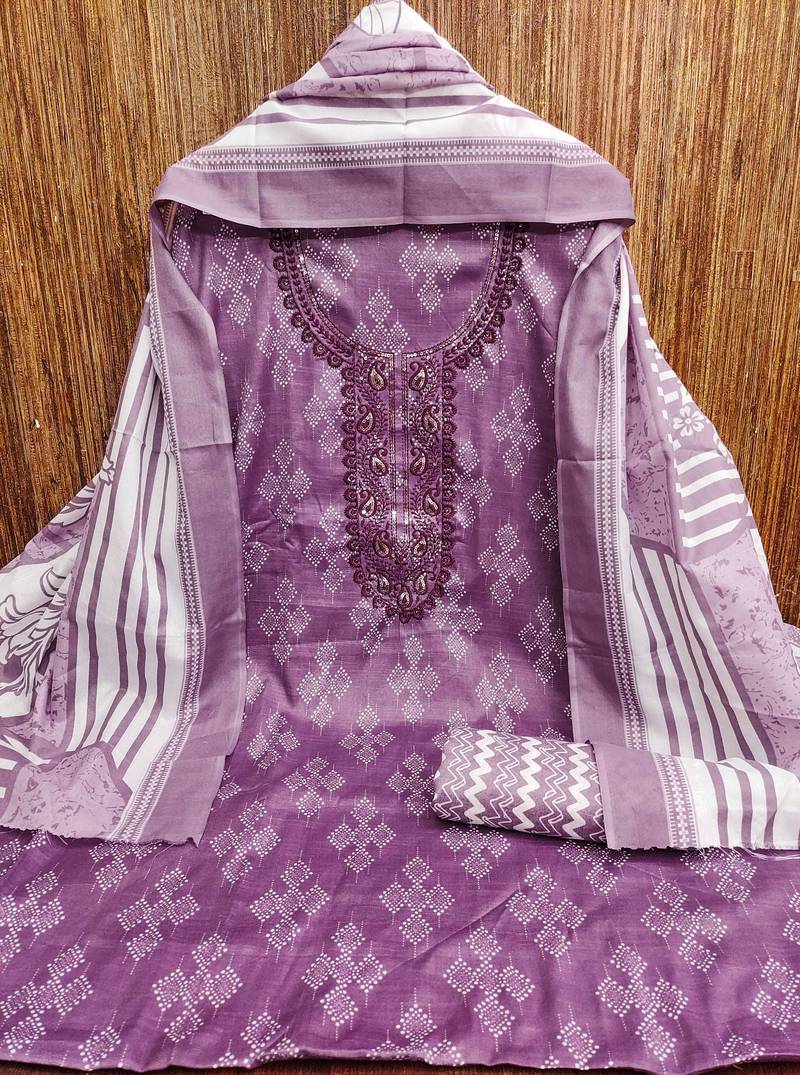 | Product Description | Wedding Perfect Designer Print And Fancy Gala Work With Stylish Dupatta Straight Style 2.00 Mtr Unstitched Dress Material Top Of Purple Colour Cotton Fabric Also Including 2.00 Mtr Chudidar Style Bottom Piece Material Of Purple Colour Cotton Fabric With 2.00 Mtr Dupatta Of Multi Colour Cotton Fabric By Shadow & Saining Brand |