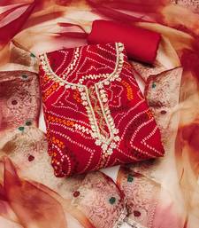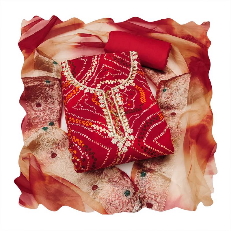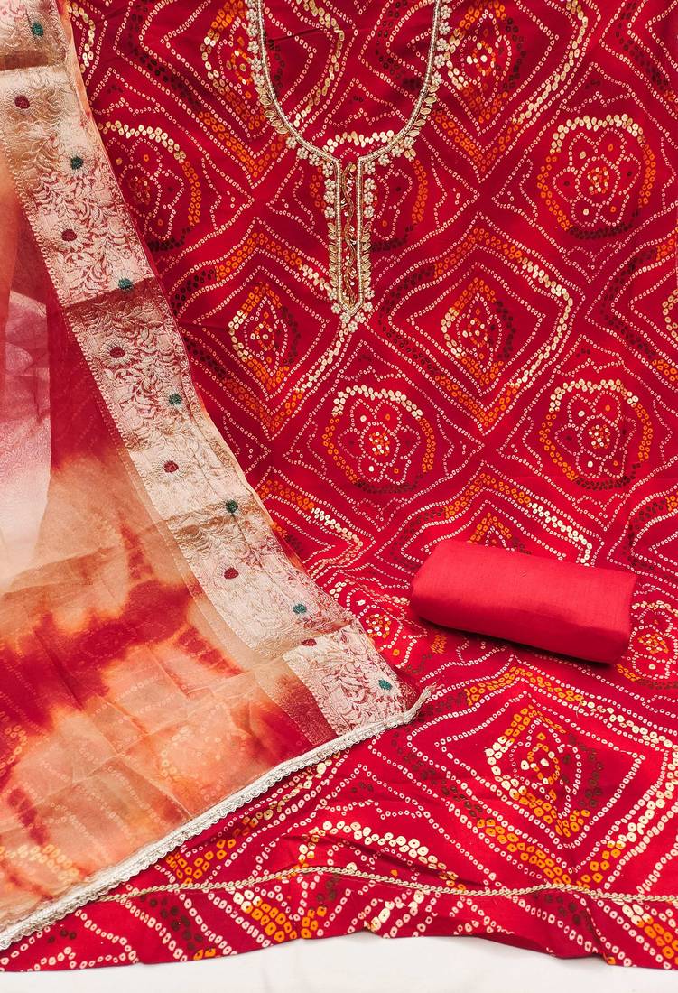 | Product Description | Versatile Designer Bandhani Print Handwork And Fancy Border With Stylish Saburi Printed Dupatta Straight Style 2.00 Mtr Unstitched Dress Material Top Of Red Colour Jam Cotton Fabric Also Including 2.40 Mtr Chudidar Style Bottom Piece Material Of Red Colour Rayon Fabric With 2.10 Mtr Dupatta Of Red Colour Banarasi Organja Fabric By Shadow & Saining Brand |
