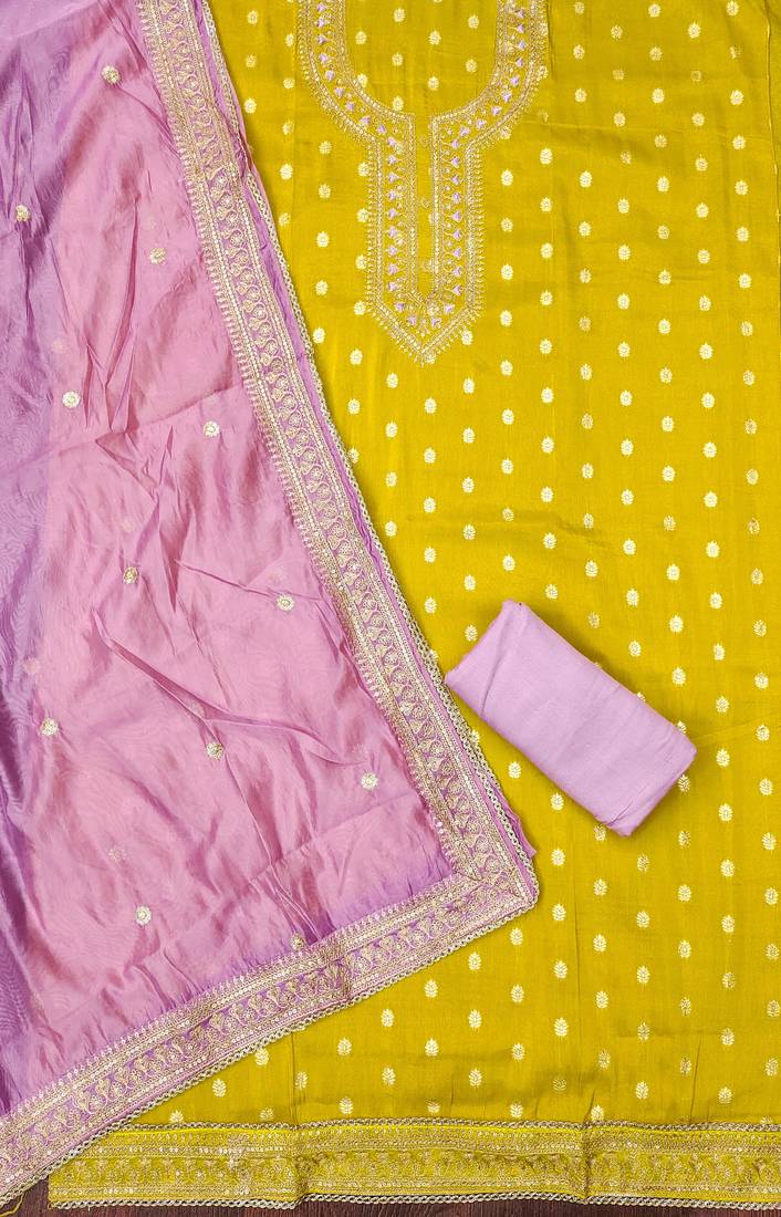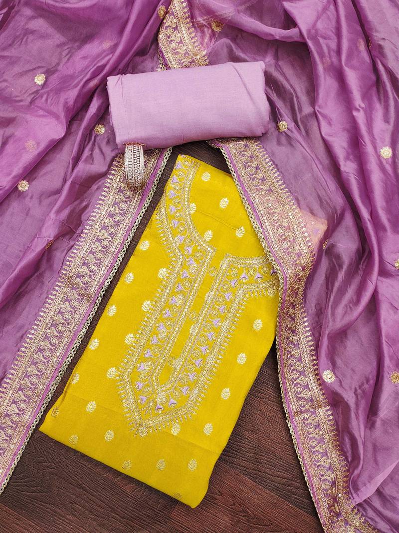 | Product Description | Designer Jari Weaving Work With Fancy Embroidery Work And Heavy Embroidery With Stylish Border Dupatta Work Straight Style 2.40 Mtr Unstitched Dress Material Top Of Yellow Colour Simmer Silk Fabric Also Including 2.50 Mtr Chudidar Style Bottom Piece Material Of Lavender Colour Reyon Fabric With 2.40 Mtr Dupatta Of Lavender Colour Heavy Organza Fabric By Shadow & Saining Brand |