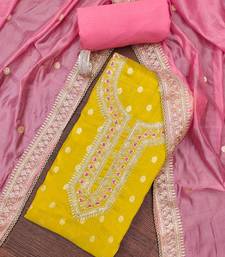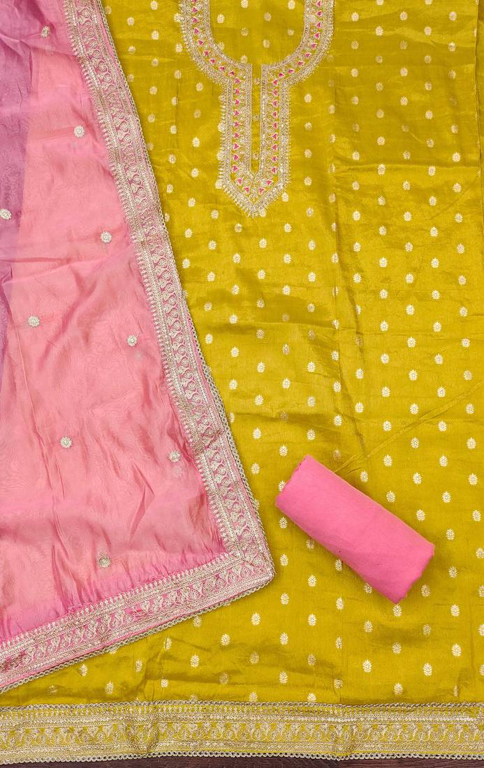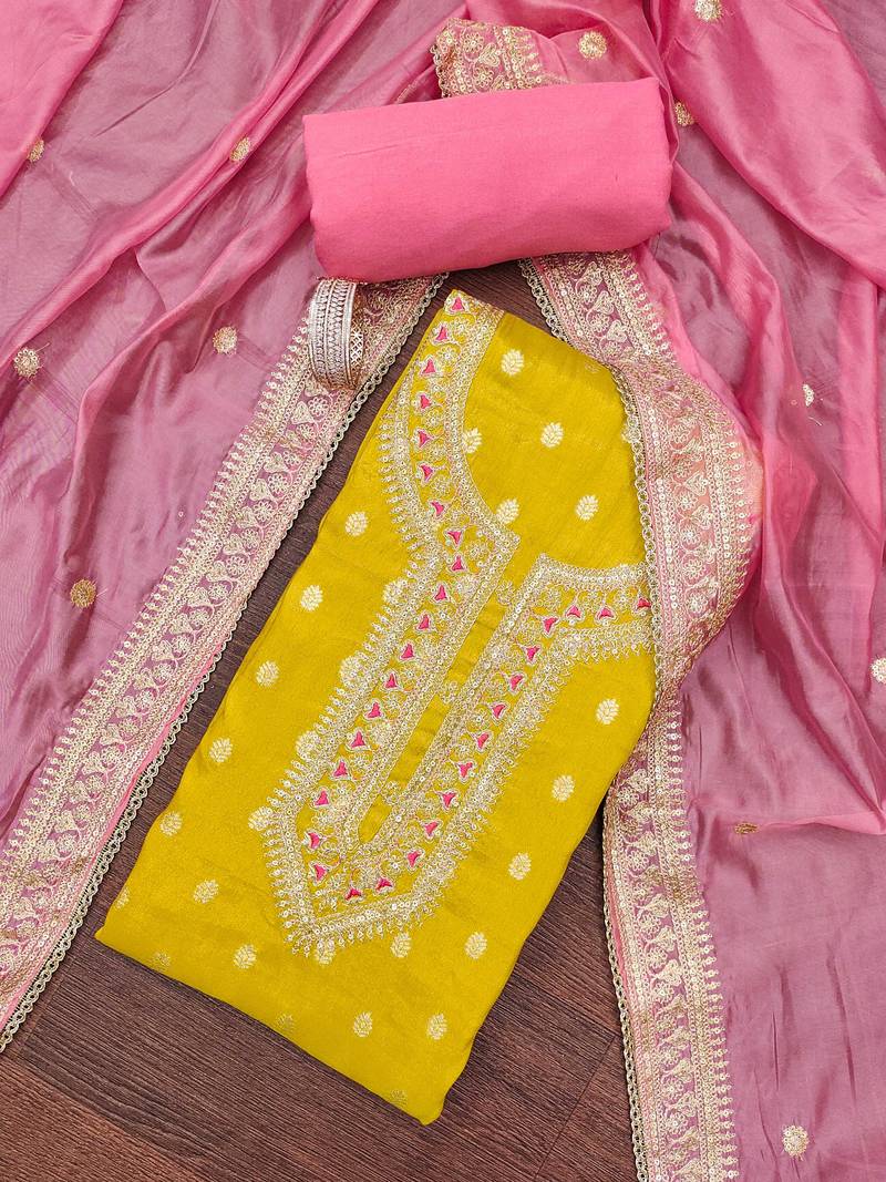 | Product Description | Appealing Designer Jari Weaving Work With Fancy Embroidery Work And Heavy Embroidery With Stylish Border Dupatta Work Straight Style 2.40 Mtr Unstitched Dress Material Top Of Yellow Colour Simmer Silk Fabric Also Including 2.50 Mtr Chudidar Style Bottom Piece Material Of Pink Colour Reyon Fabric With 2.40 Mtr Dupatta Of Pink Colour Heavy Organza Fabric By Shadow & Saining Brand |