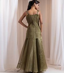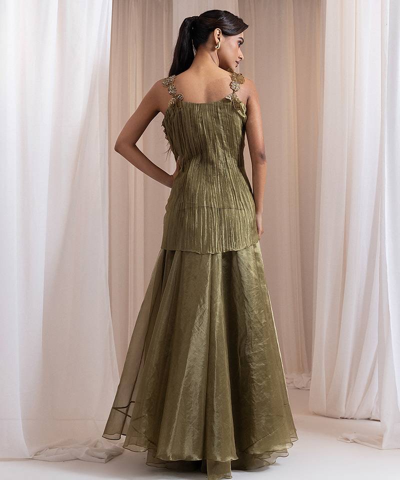 This Green Embroidered Tissue Co Ord Set Exudes Shimmery Elegance With Its Lightweight, Glossy Texture And Graceful Drape. Intricate Embroidery Adds A Festive, Artistic Charm, Enhancing The Richness Of The Fabric. Perfect For Celebrations, Parties, And Traditional Events, It Blends Luxurious Appeal With Contemporary Sophistication For A Stunning Statement Look.