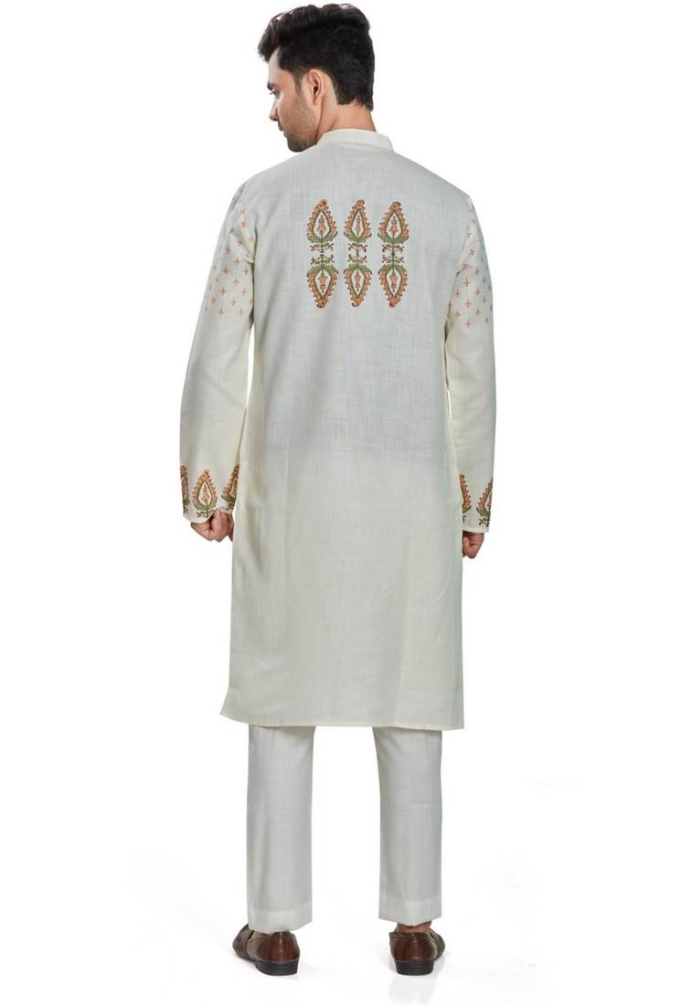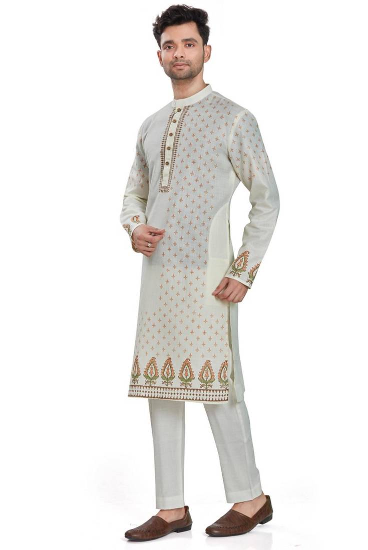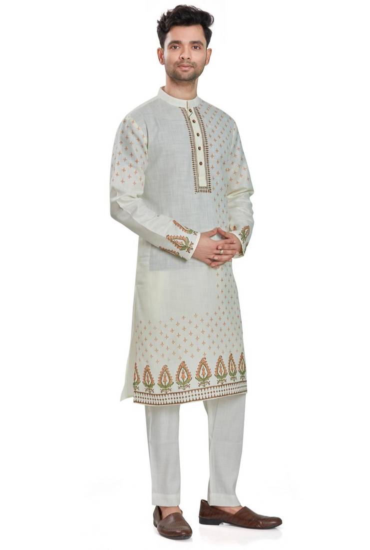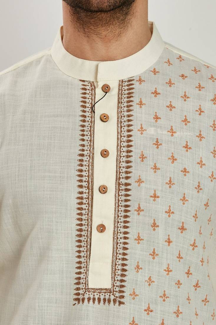 Off white hand block printed with embroidery kurta viscos kurta payjama etnic wear :: festive wear